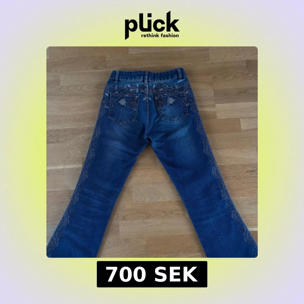 Snygga blå bootcut jeans med detaljerat broderi längs sidorna och bakfickorna. Perfekta för en unik stil med en touch av vintage. De har en klassisk femficksdesign och en bekväm passform.