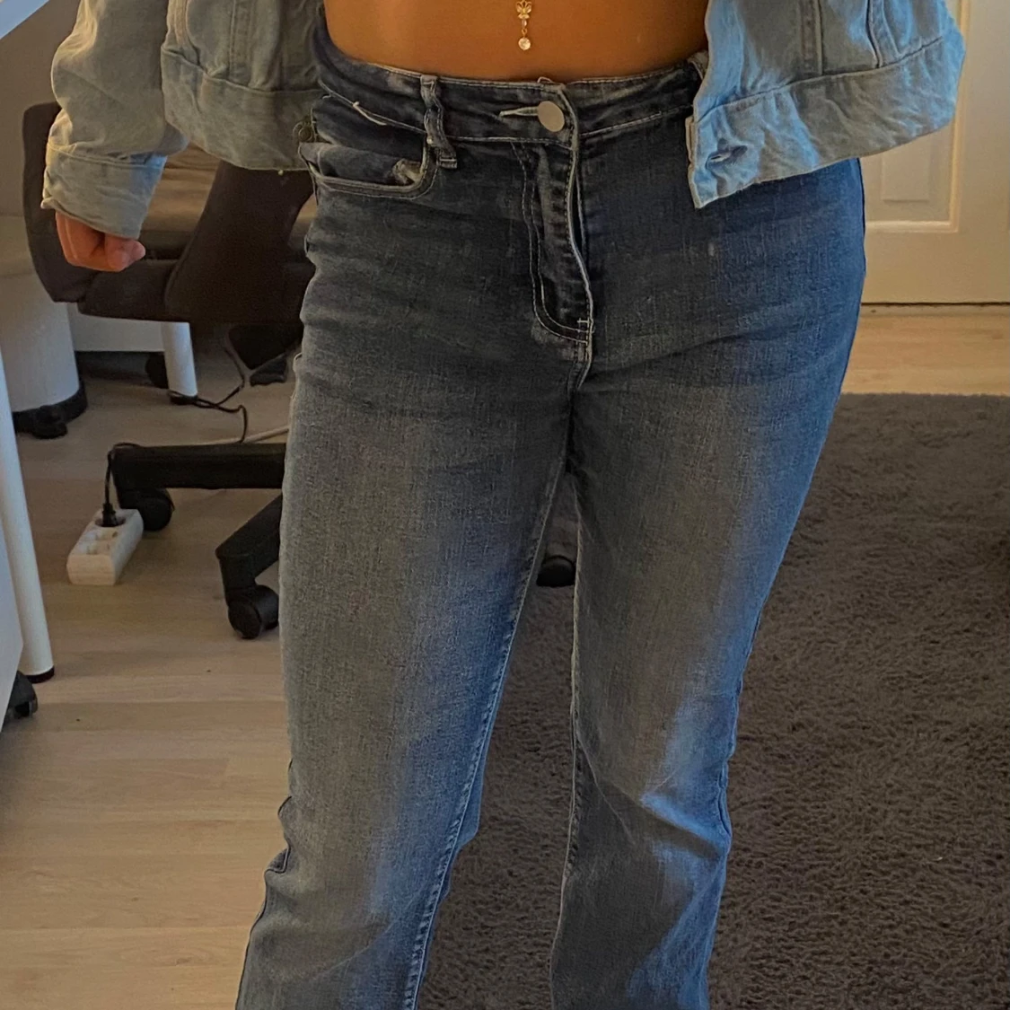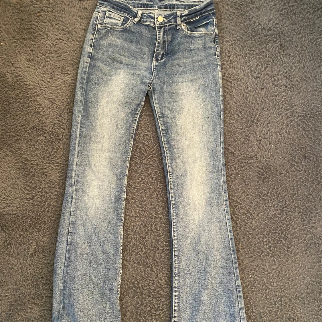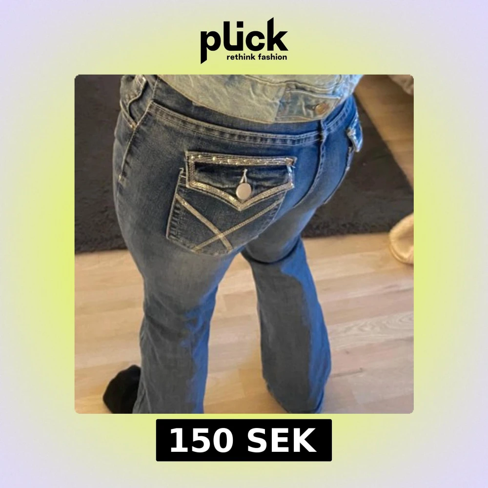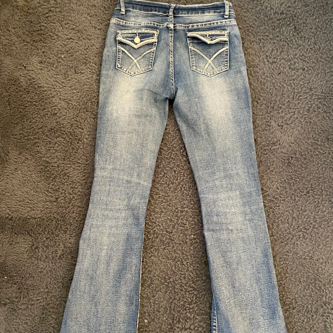 Säljer ett par blå bootcut jeans med snygga detaljer på bakfickorna, inklusive dekorativa sömmar och knappar. Jeansen har normal passform och klassisk femficksdesign. Perfekta för dig som vill ha ett par jeans med lite extra stil.