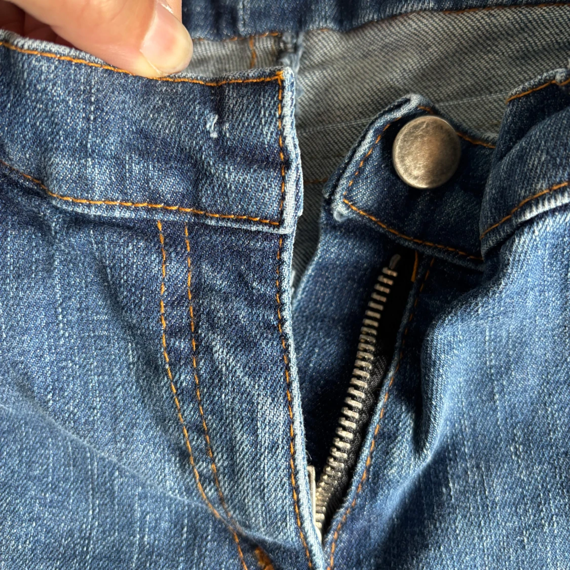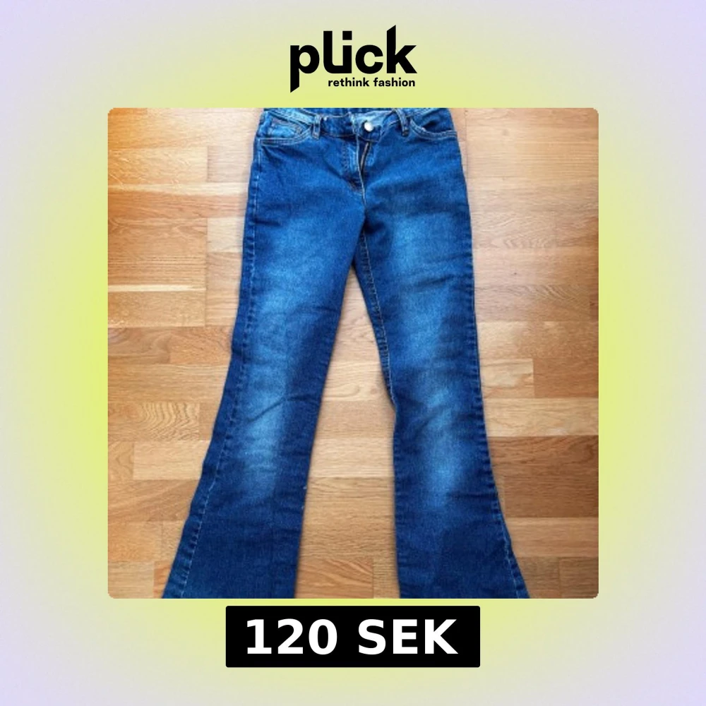 Säljer ett par klassiska blå bootcut jeans med snyggt slitna detaljer och dragkedja framtill. Jeansen har normal passform och är tillverkade i tåligt denimtyg. Låg midja. Finns inget hål för gylfknappen så det måste man göra själv! Passar xxs-xs