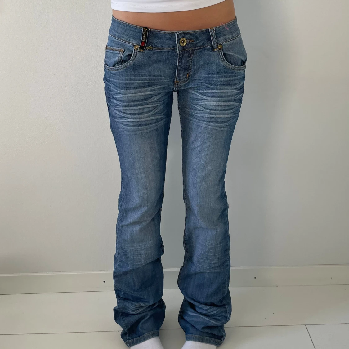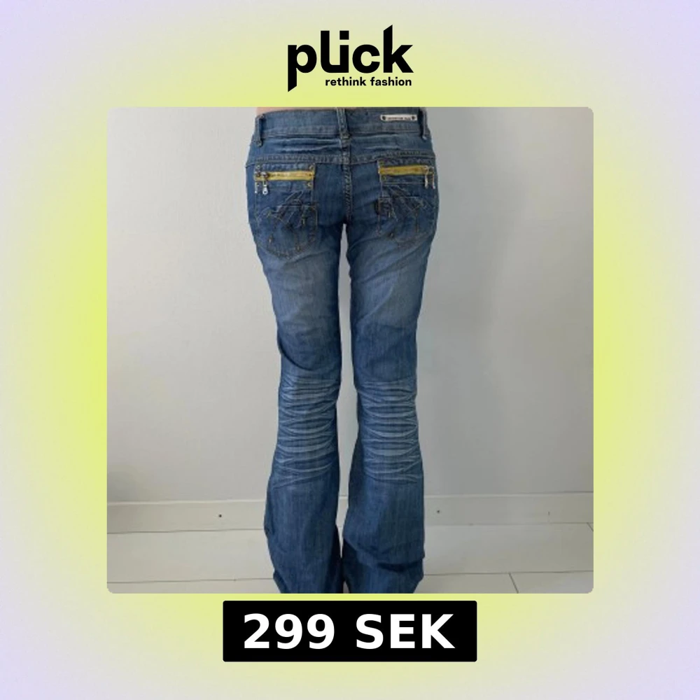 Snygga blå jeans med bootcut passform och låg midja. Jeansen har slitningar framtill, dekorativa sömmar och coola dragkedjor i gult på bakfickorna. Perfekta för dig som gillar detaljer och en avslappnad stil.
