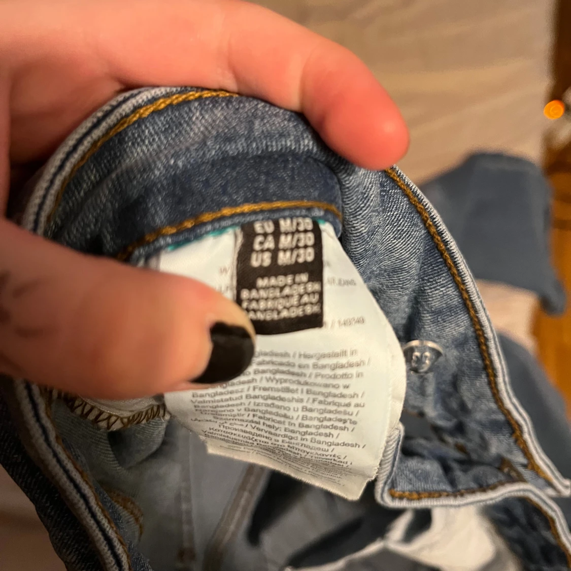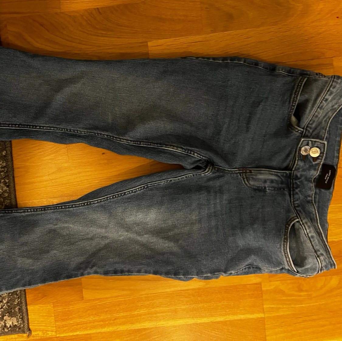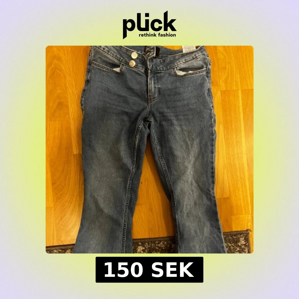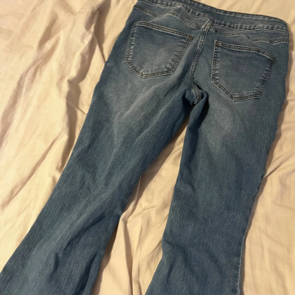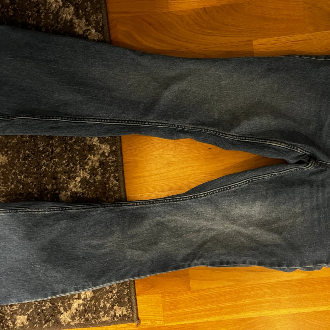 Säljer ett par blå bootcut jeans med snygg tvätt och dubbla silverfärgade knappar i midjan. Jeansen har klassiska fickor fram och bak, och är tillverkade i mjukt denimtyg. Perfekta för dig som gillar en lite utsvängd look!