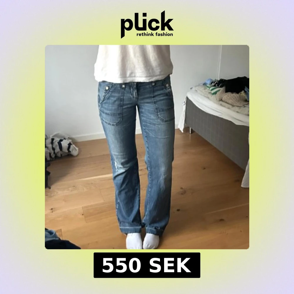 Säljer ett par klassiska blå jeans med bootcut passform och snygga fickdetaljer både fram och bak. Jeansen har normalhög midja och är tillverkade i ett mjukt denimtyg. Perfekta för en avslappnad stil.