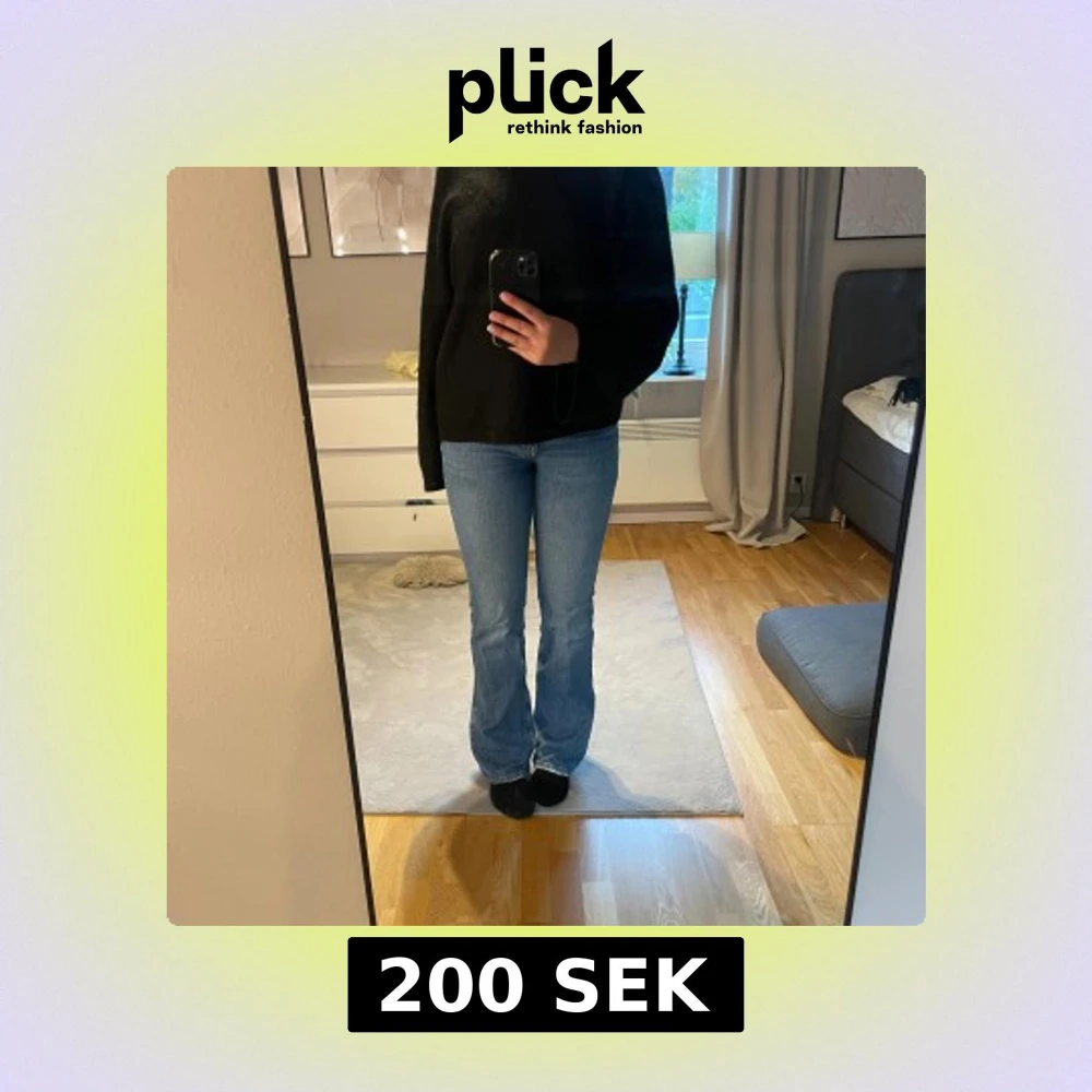 Säljer ett par klassiska blå jeans med bootcut-modell och hög midja. Jeansen har en snygg, något utsvängd passform nertill och är tillverkade i ett robust denimtyg. Perfekta för dig som gillar en tidlös och avslappnad stil.