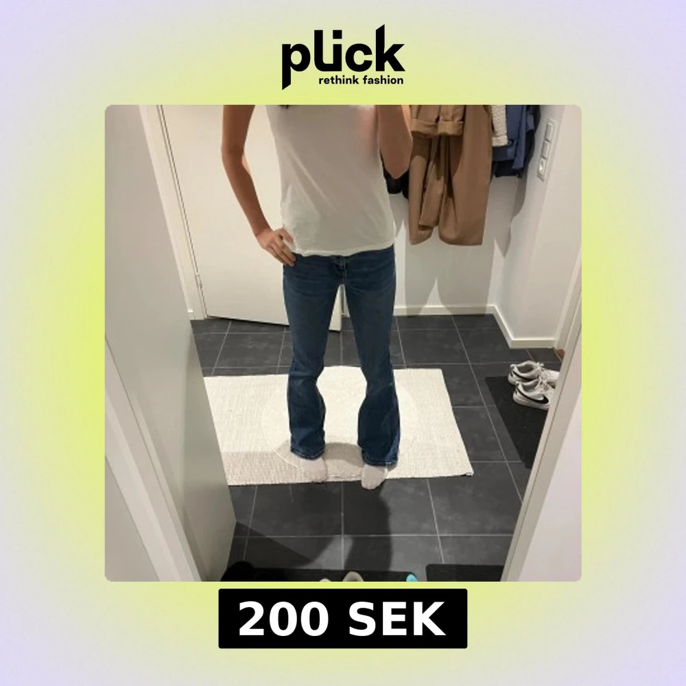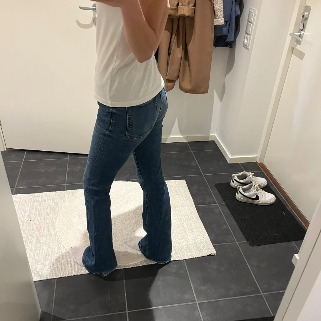 Snygga blå jeans med bootcut-modell och hög midja. Jeansen har klassisk femficksdesign och är tillverkade i ett mjukt denimtyg som sitter skönt. Perfekta för dig som gillar en tidlös och trendig look. Har blivit lite nertrampade på ena benet därav priset!