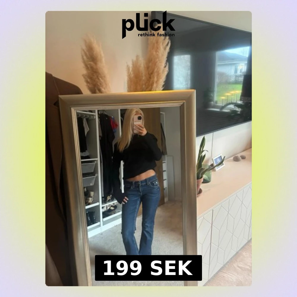 Säljer ett par snygga blå jeans med bootcut och låg midja. Jeansen har klassiska fickor fram och bak med silverfärgade knappar och detaljer. Materialet är jeans med en skön stretch och passformen är normal. Perfekta för dig som gillar retrovibbar och markerad siluett.