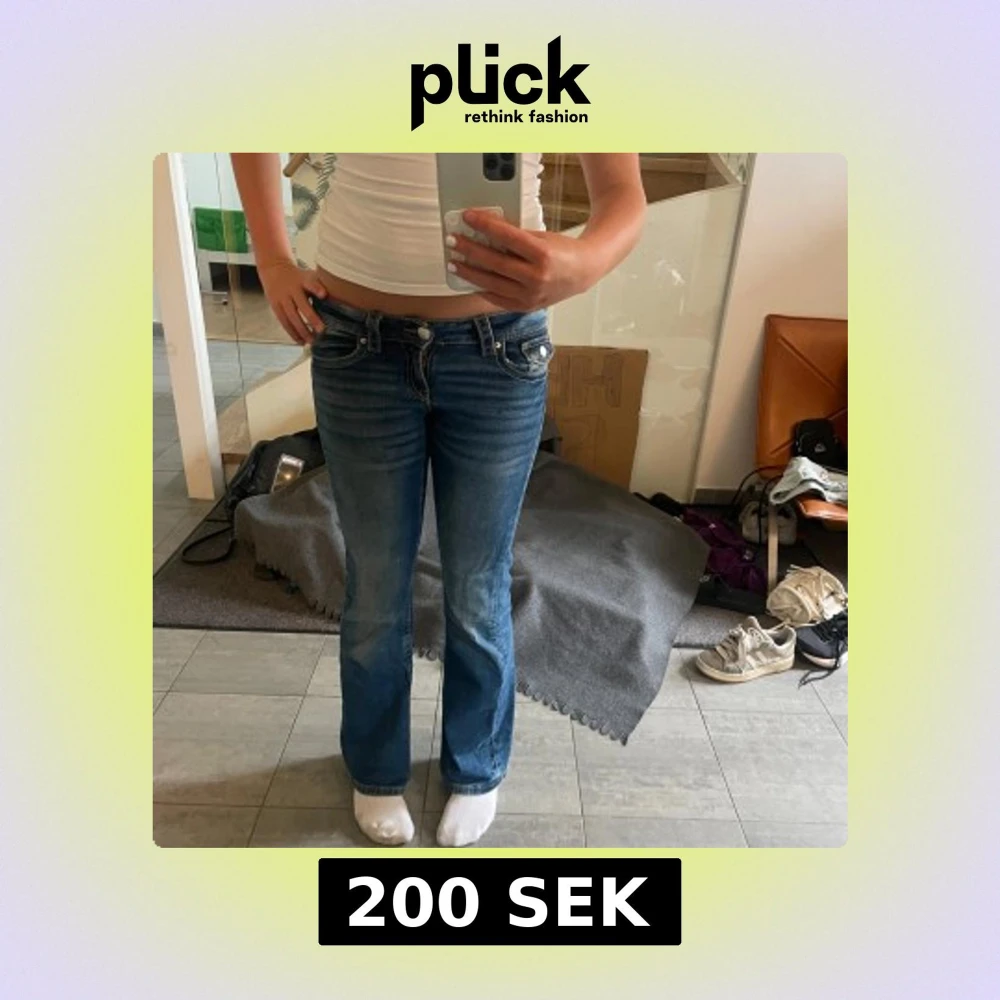 Säljer ett par blå bootcut jeans med låg midja och snygga detaljerade bakfickor med knappar. Jeansen har klassisk femficksdesign och är tillverkade i stretchigt denim för en bekväm passform.