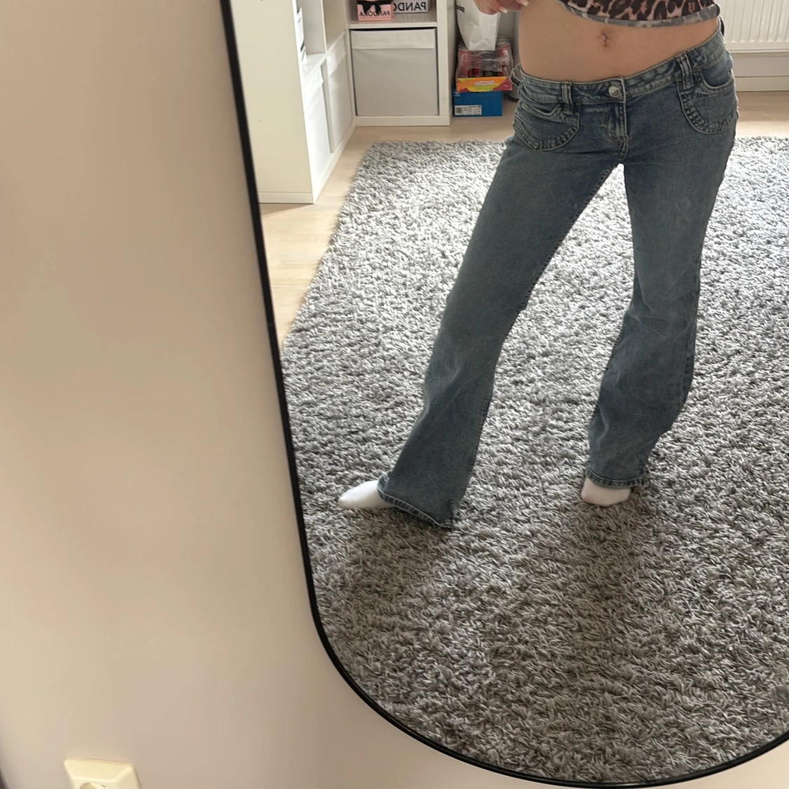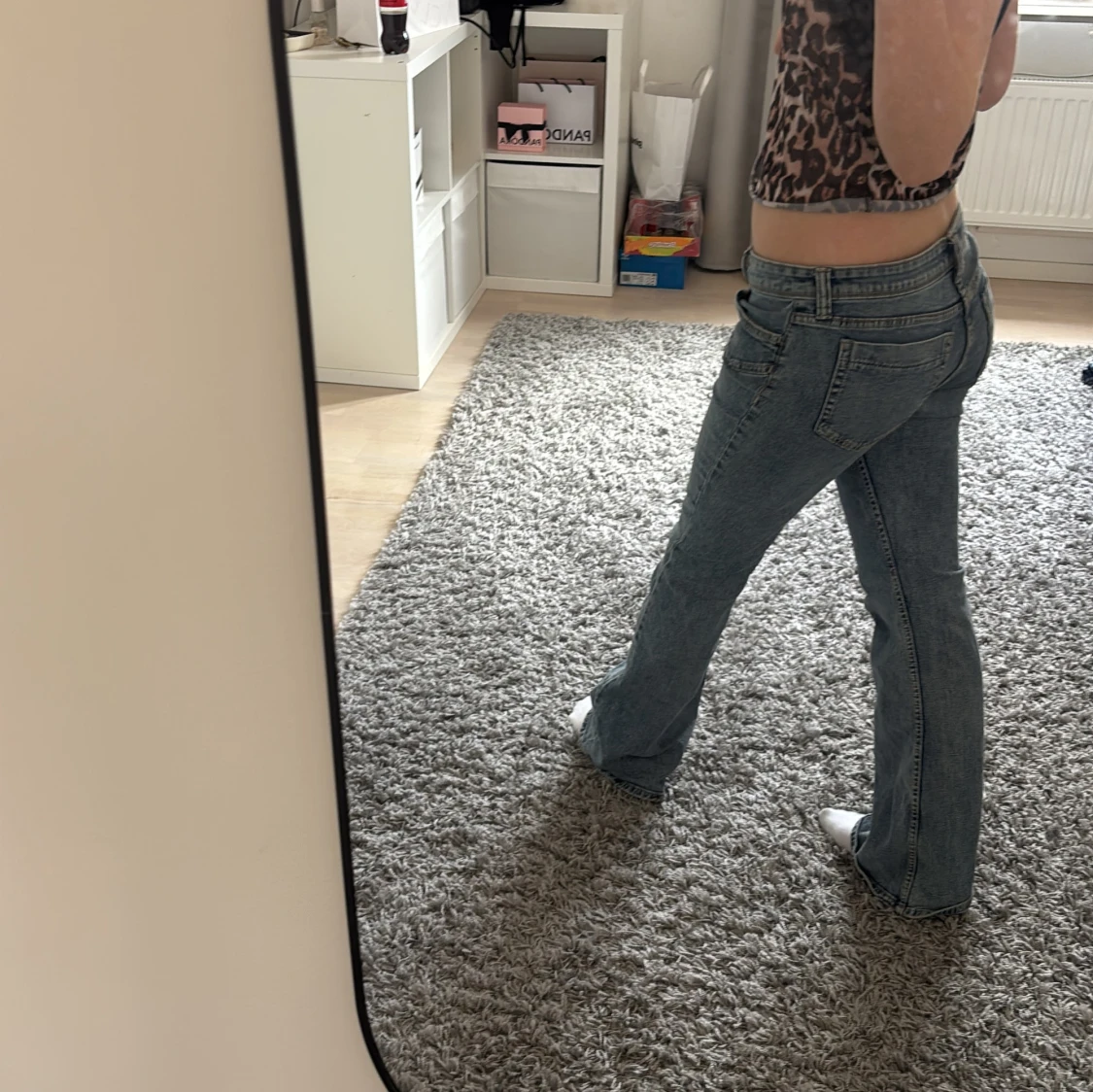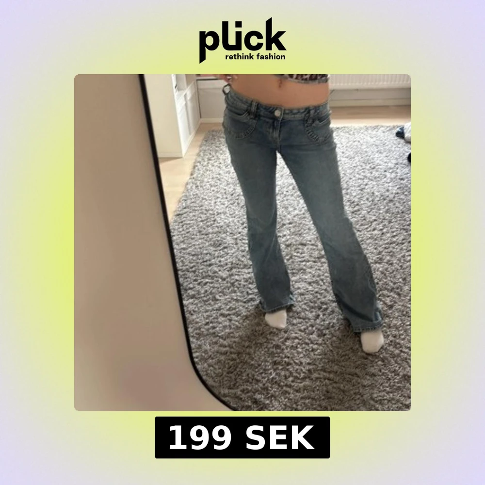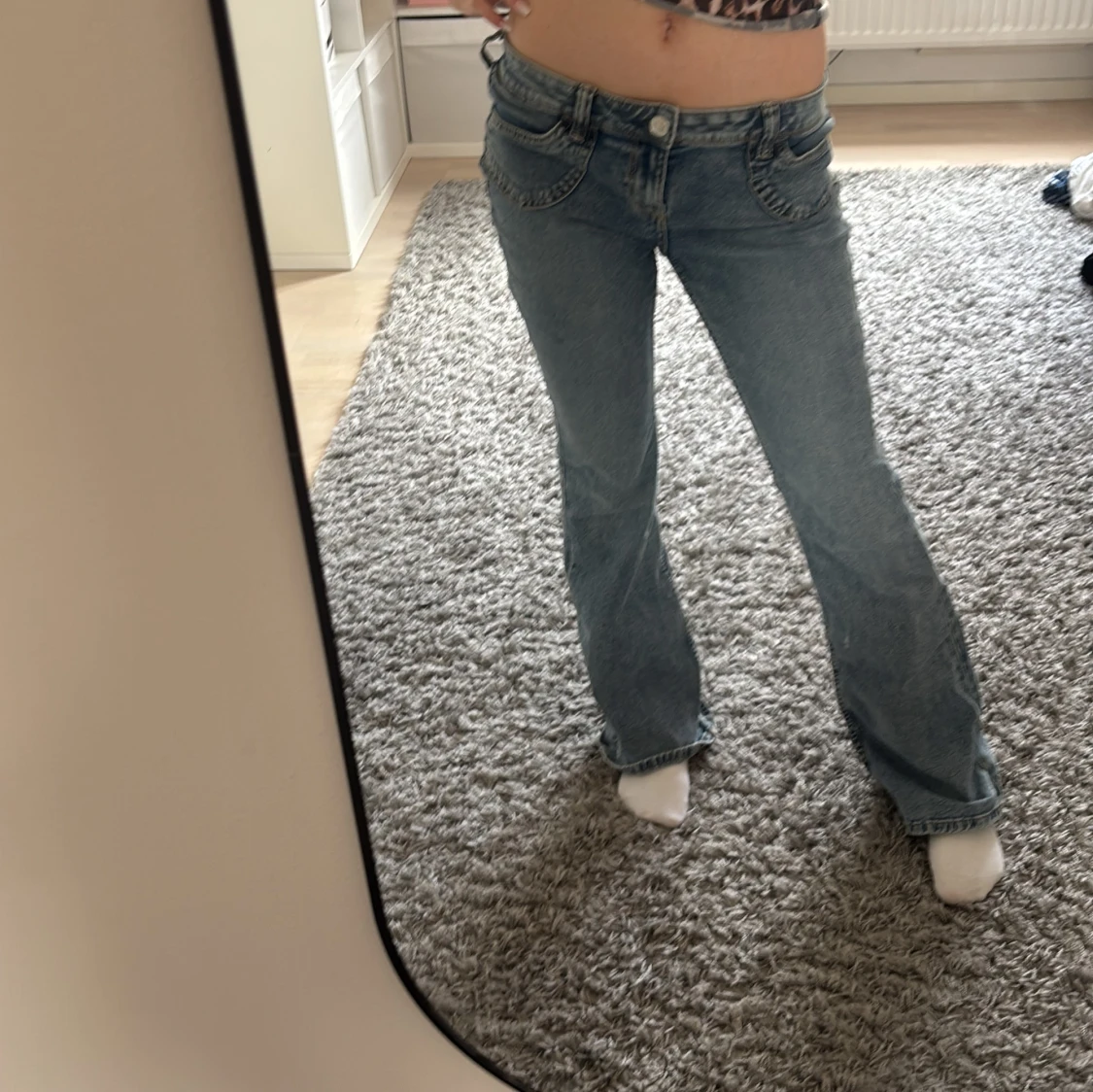 Säljer ett par klassiska blå jeans med bootcut och låg midja. Jeansen har fem fickor och stängs med dragkedja och knapp. Perfekta för en avslappnad och trendig look.