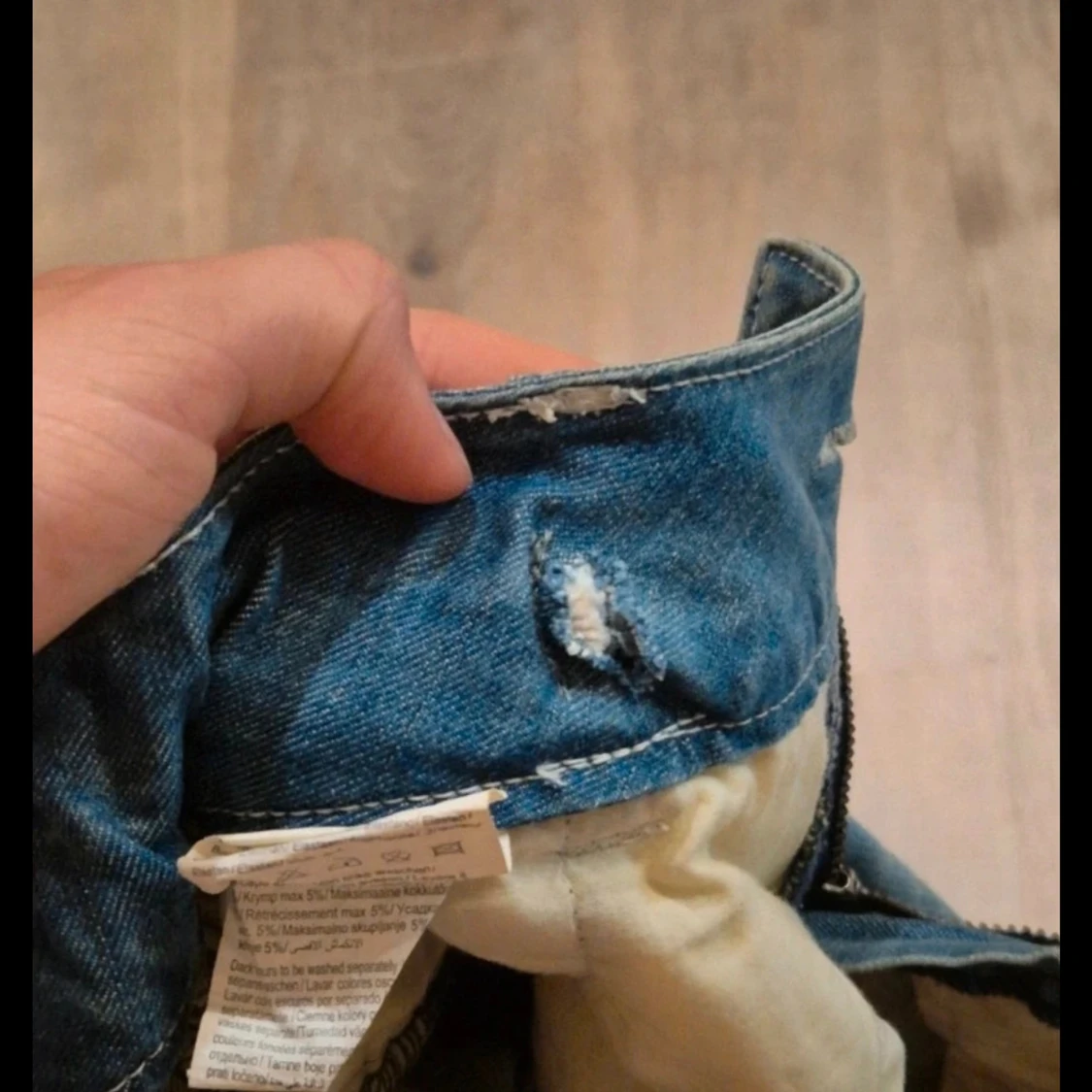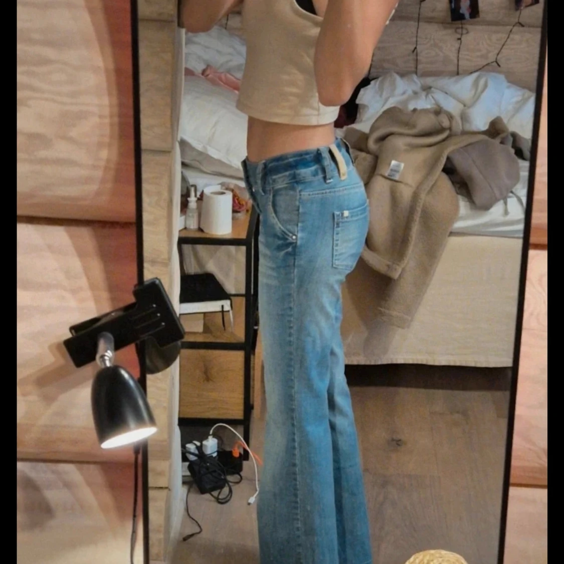 Säljer ett par ljusblå bootcut jeans med låg midja. De är avklippta i benen och jag har sytt in resor I midjan ( inte tajt)