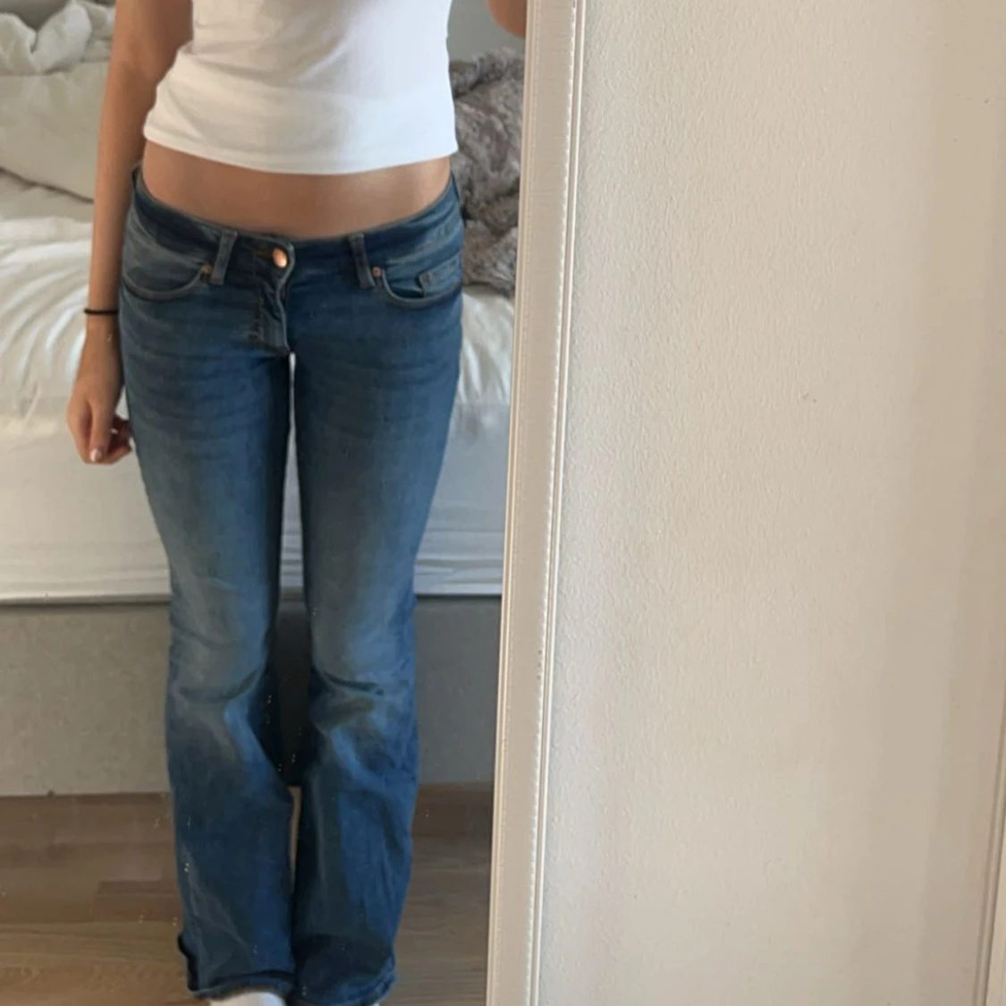 Snygga blå jeans med bootcut och låg midja. Jeansen har klassisk femficksdesign, dragkedja och knapp framtill. Materialet är stretchigt denim som sitter skönt och formar sig efter kroppen. Perfekta för dig som gillar en retroinspirerad look.