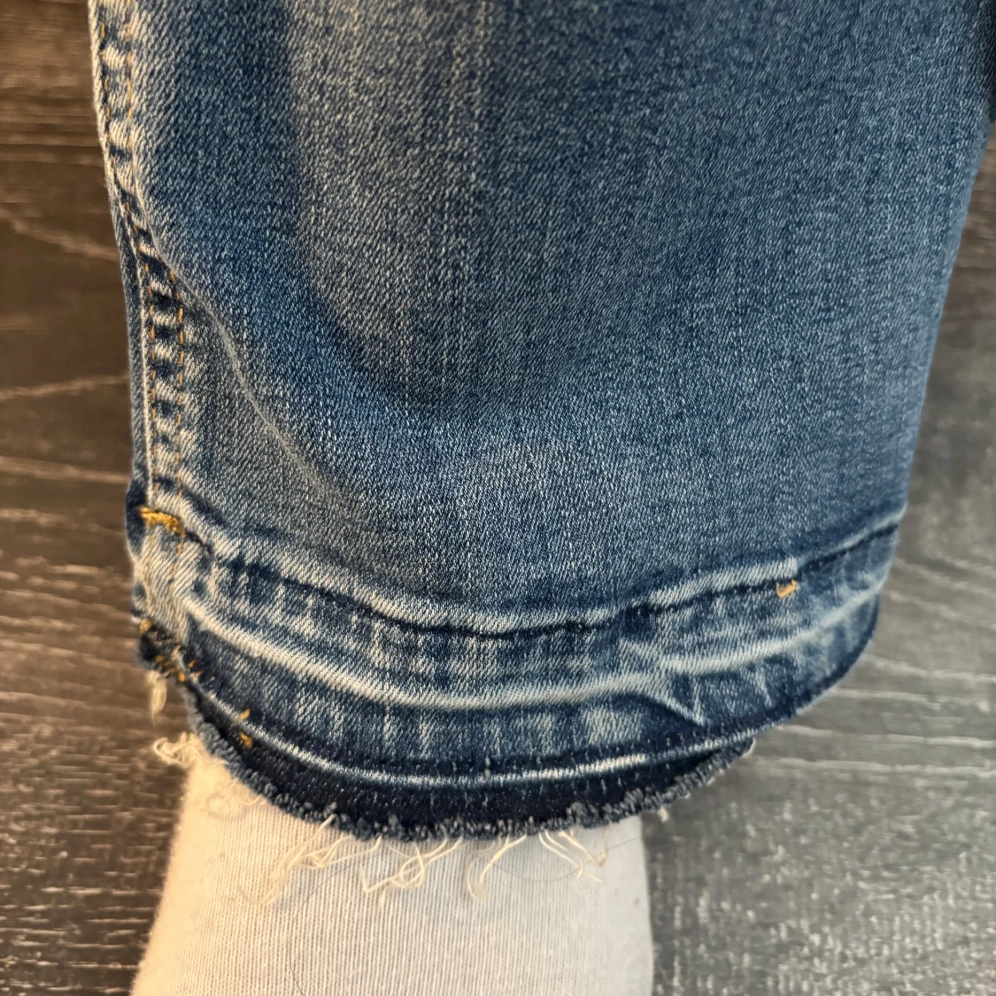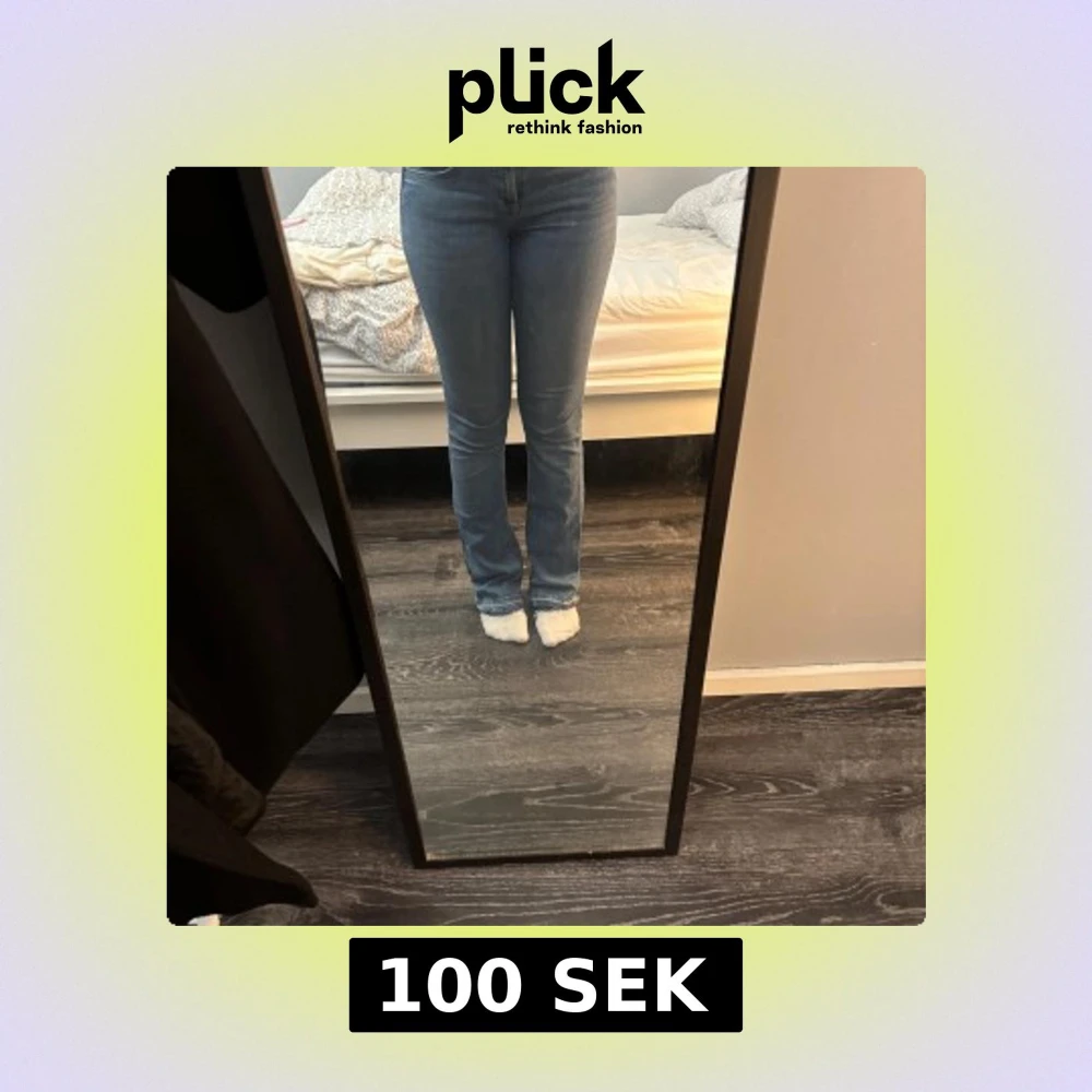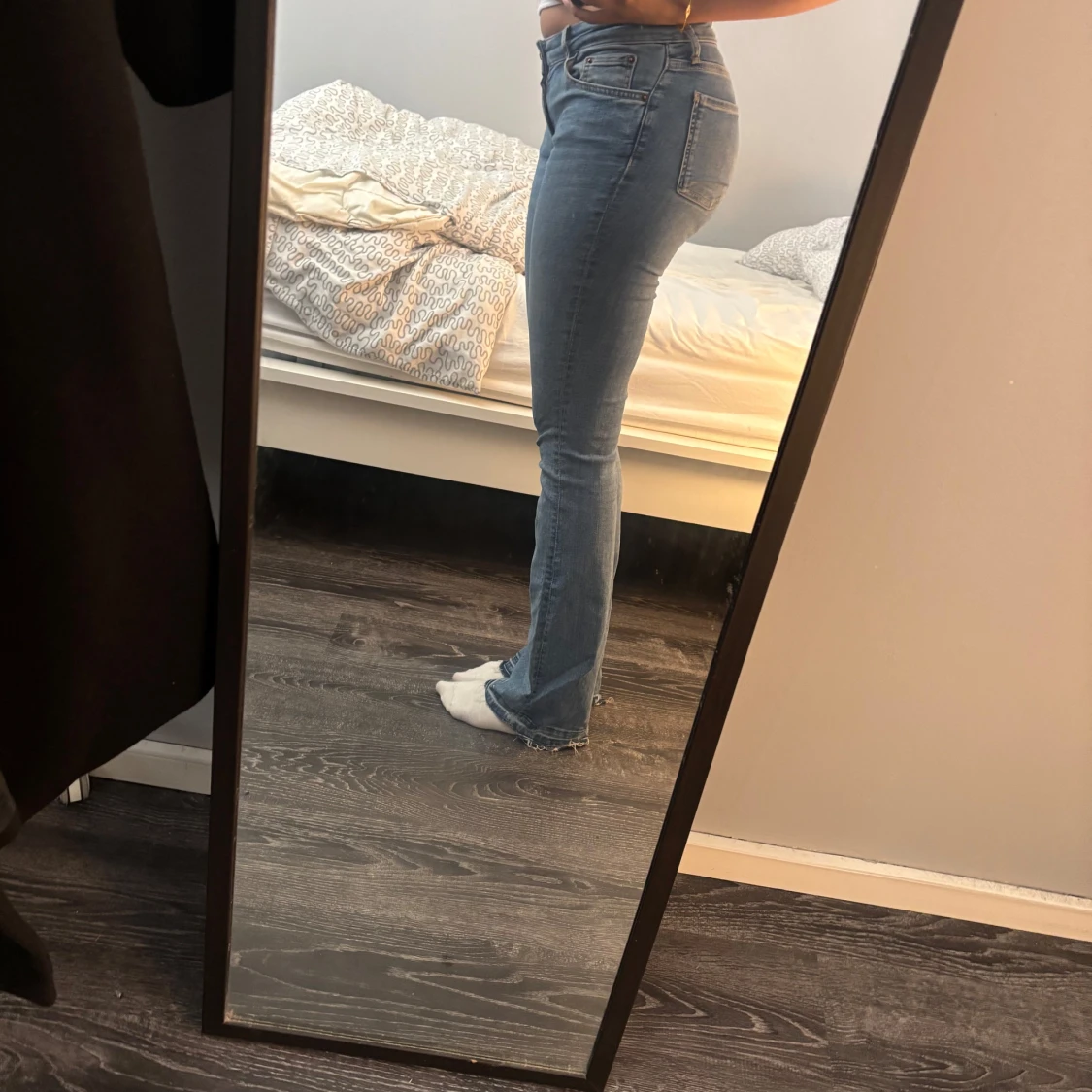 Säljer ett par ljusblå bootcut jeans med hög midja och rå, fransig kant nertill. Jeansen har klassisk femficksdesign och sitter snyggt över höften och låren innan de släpper ut vid vaden. Perfekta till sneakers eller boots.