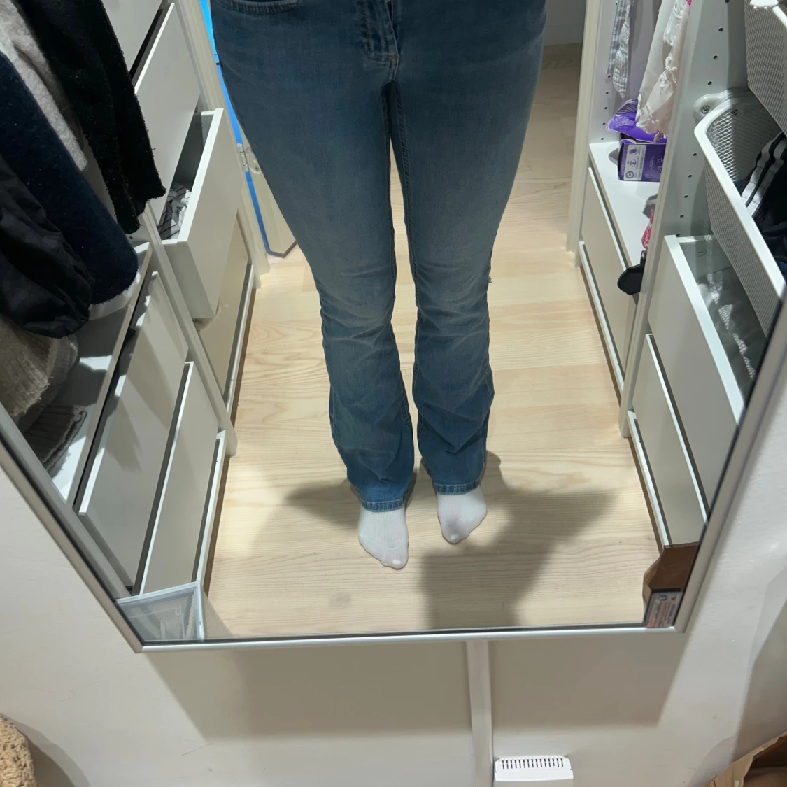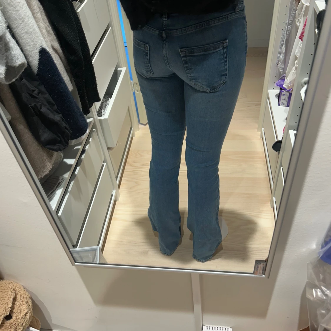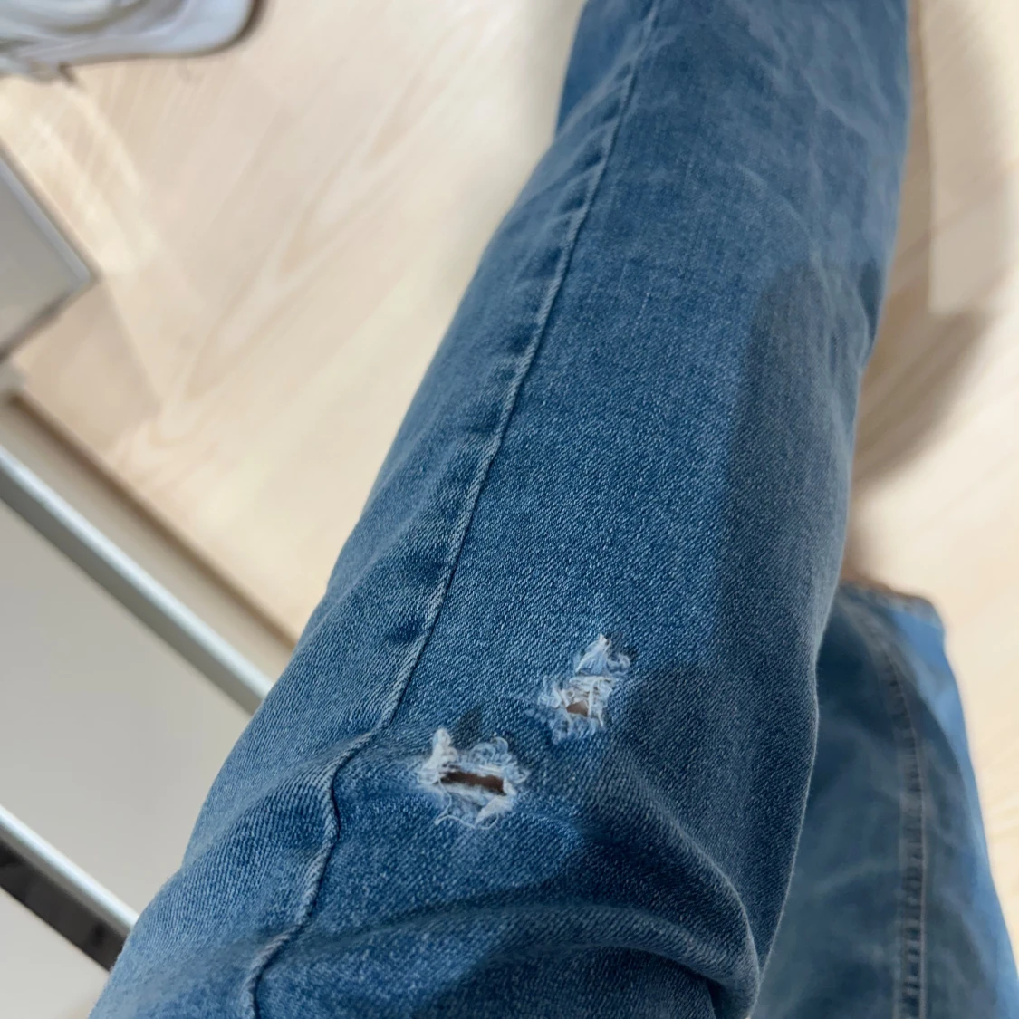 Säljer ett par blå jeans med bootcut passform och klassisk femficksdesign. Jeansen har en snygg sliten detalj på ena benet och är tillverkade i mjukt denimtyg. Perfekt för dig som gillar en avslappnad och trendig look.