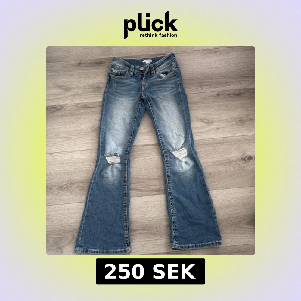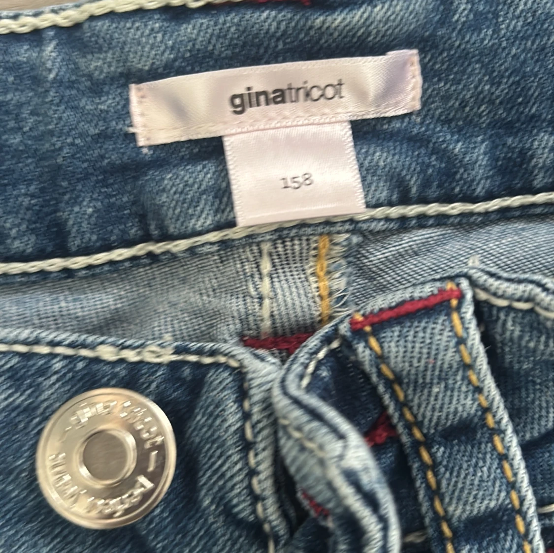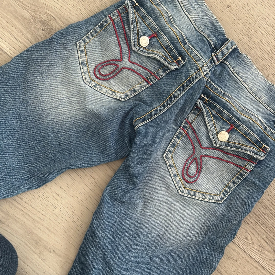 Snygga blå bootcut jeans från Gina Tricot med slitningar på knäna och coola röda broderier på bakfickorna. Jeansen har kontrastsömmar i gult och rött, klassisk femficksdesign och en lätt tvättad look. Perfekta för dig som gillar en avslappnad och trendig stil. använd en gång men de e ett litet hål vid gylfen💓
