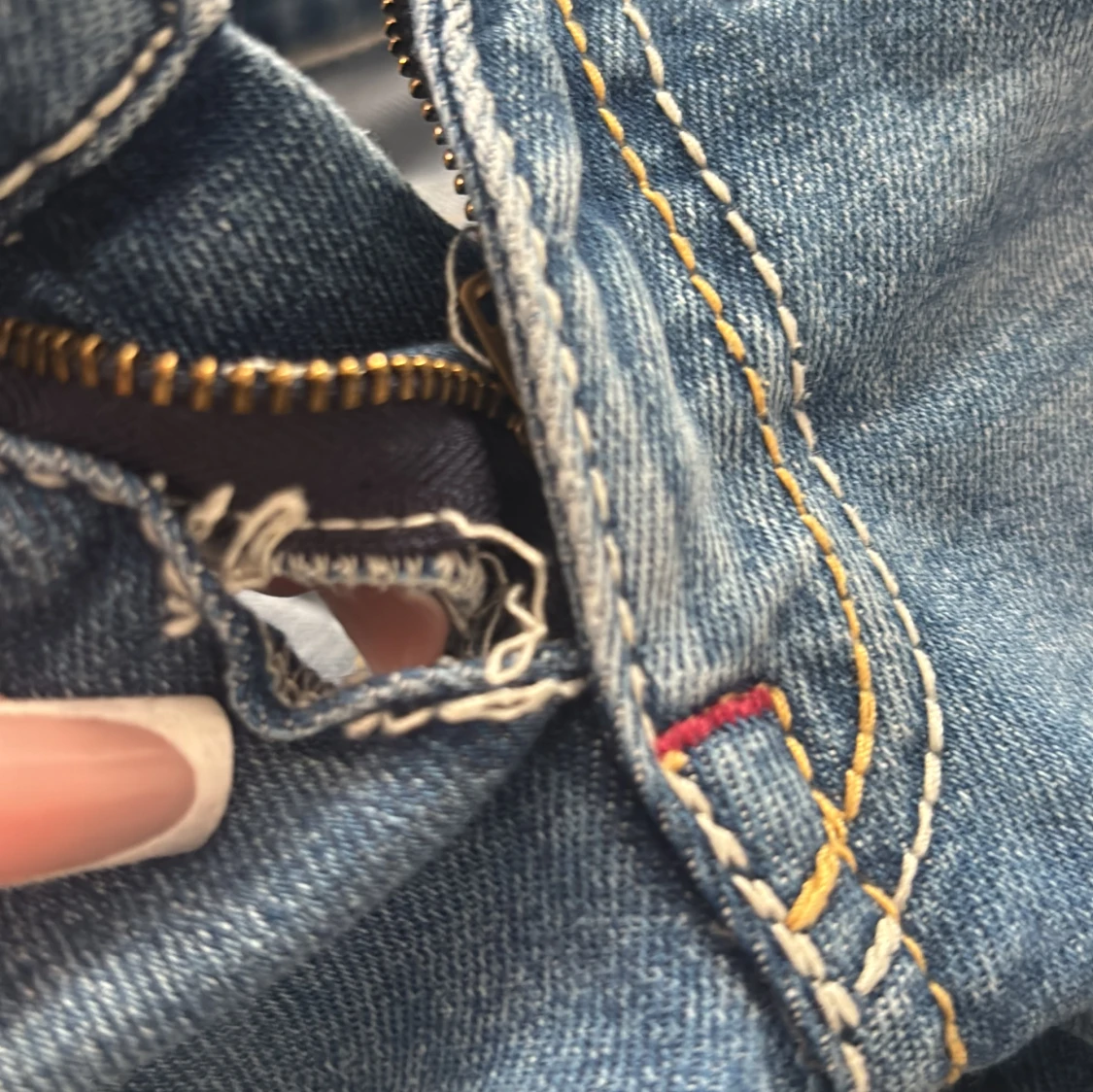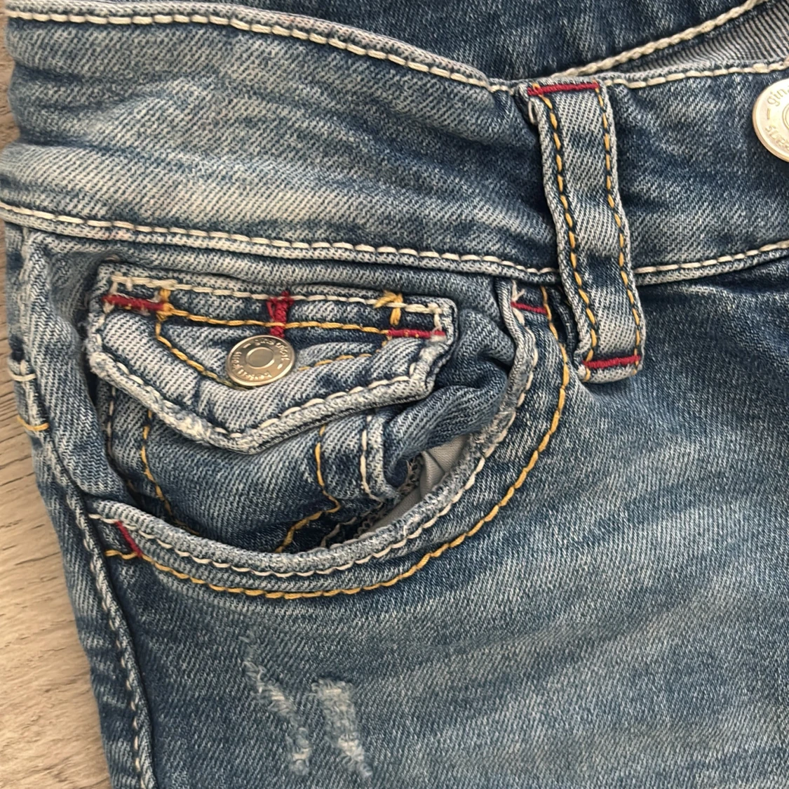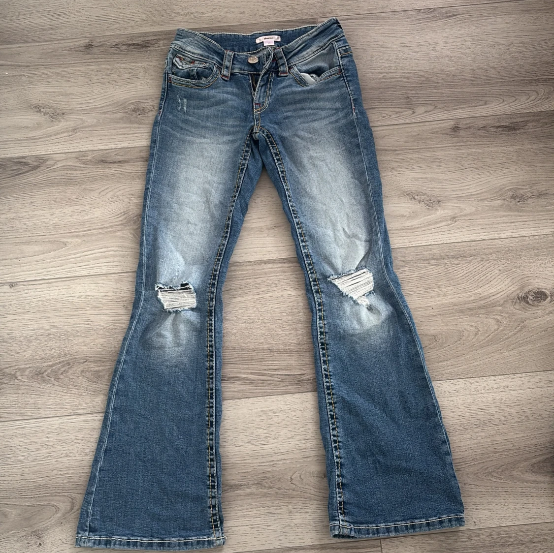 Snygga blå bootcut jeans från Gina Tricot med slitningar på knäna och coola röda broderier på bakfickorna. Jeansen har kontrastsömmar i gult och rött, klassisk femficksdesign och en lätt tvättad look. Perfekta för dig som gillar en avslappnad och trendig stil. använd en gång men de e ett litet hål vid gylfen💓