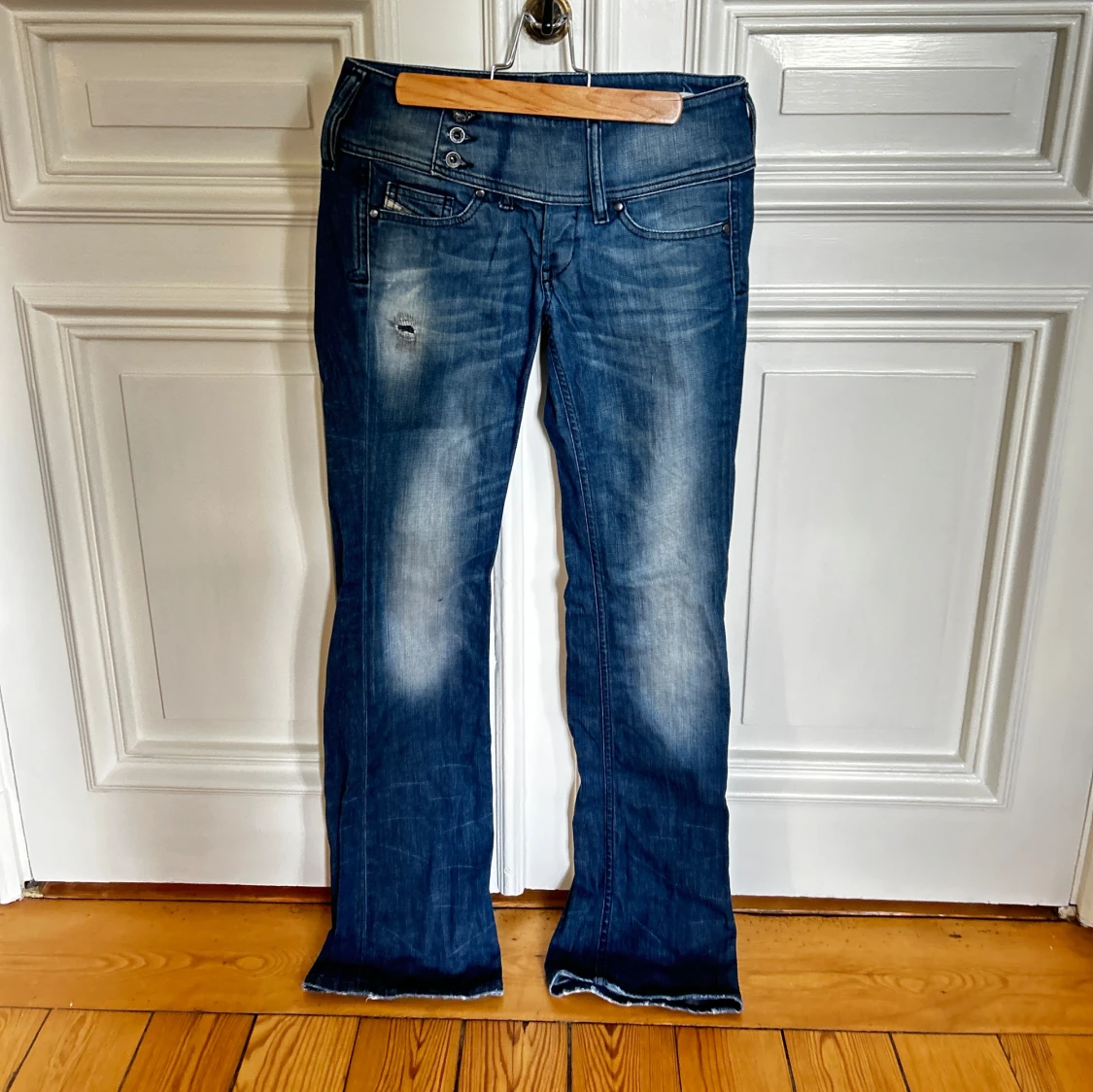 Snygga blå jeans med bootcut passform och låg midja. Jeansen har slitna detaljer och en klassisk femficksdesign med knappgylf. Perfekta till vardags för en avslappnad stil.