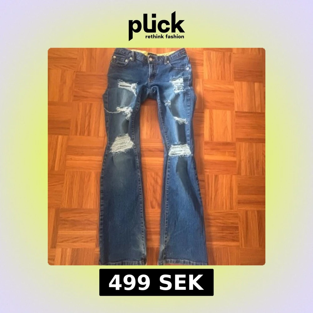 Säljer ett par blå bootcut jeans från Bik Bok i storlek M. Jeansen har flera slitningar och hål framtill för en edgy look, samt råa kanter vid bensluten. Klassisk femficksmodell med broderade detaljer på bakfickorna. Passar S. Öppen för prisdiskution