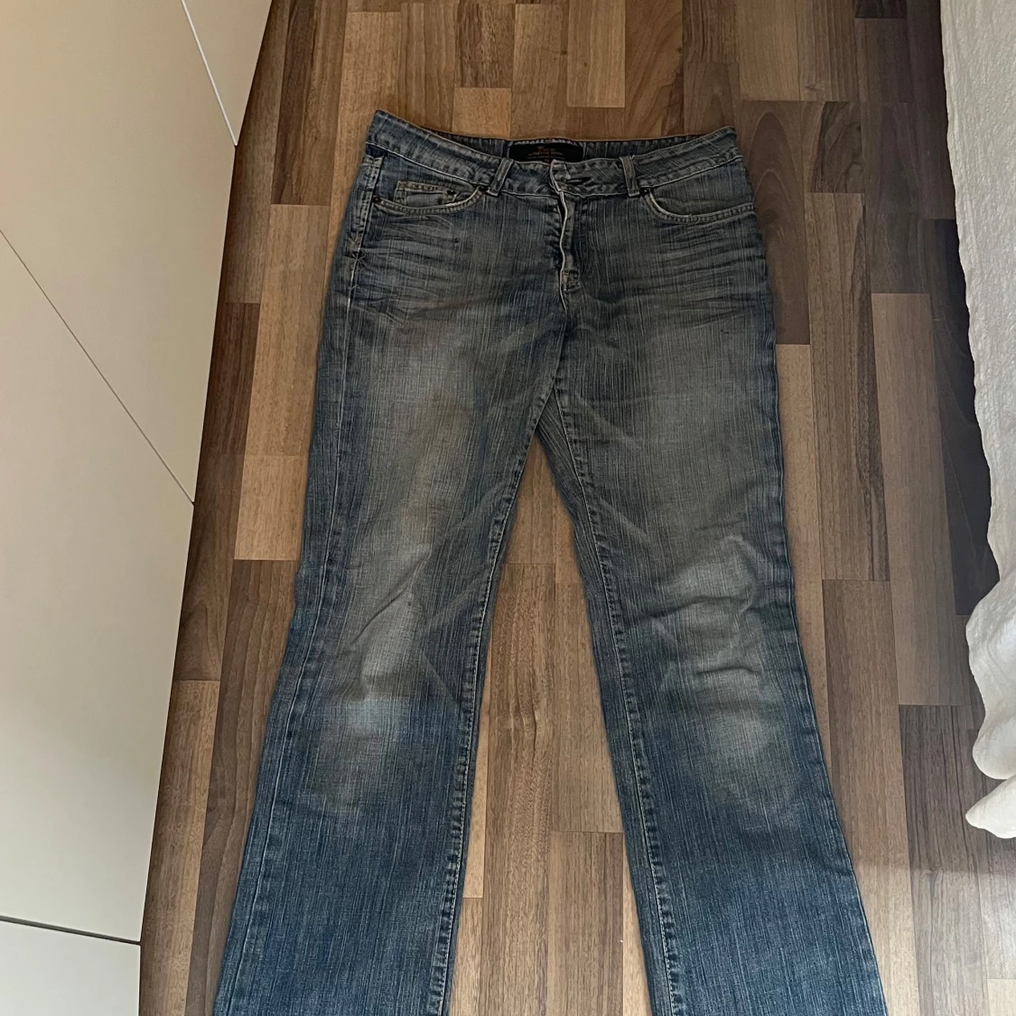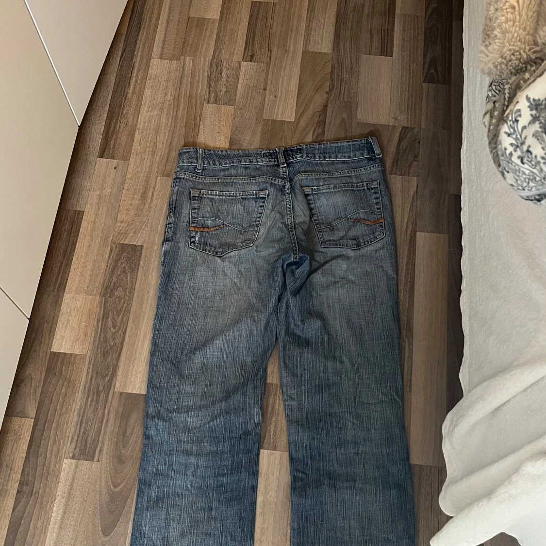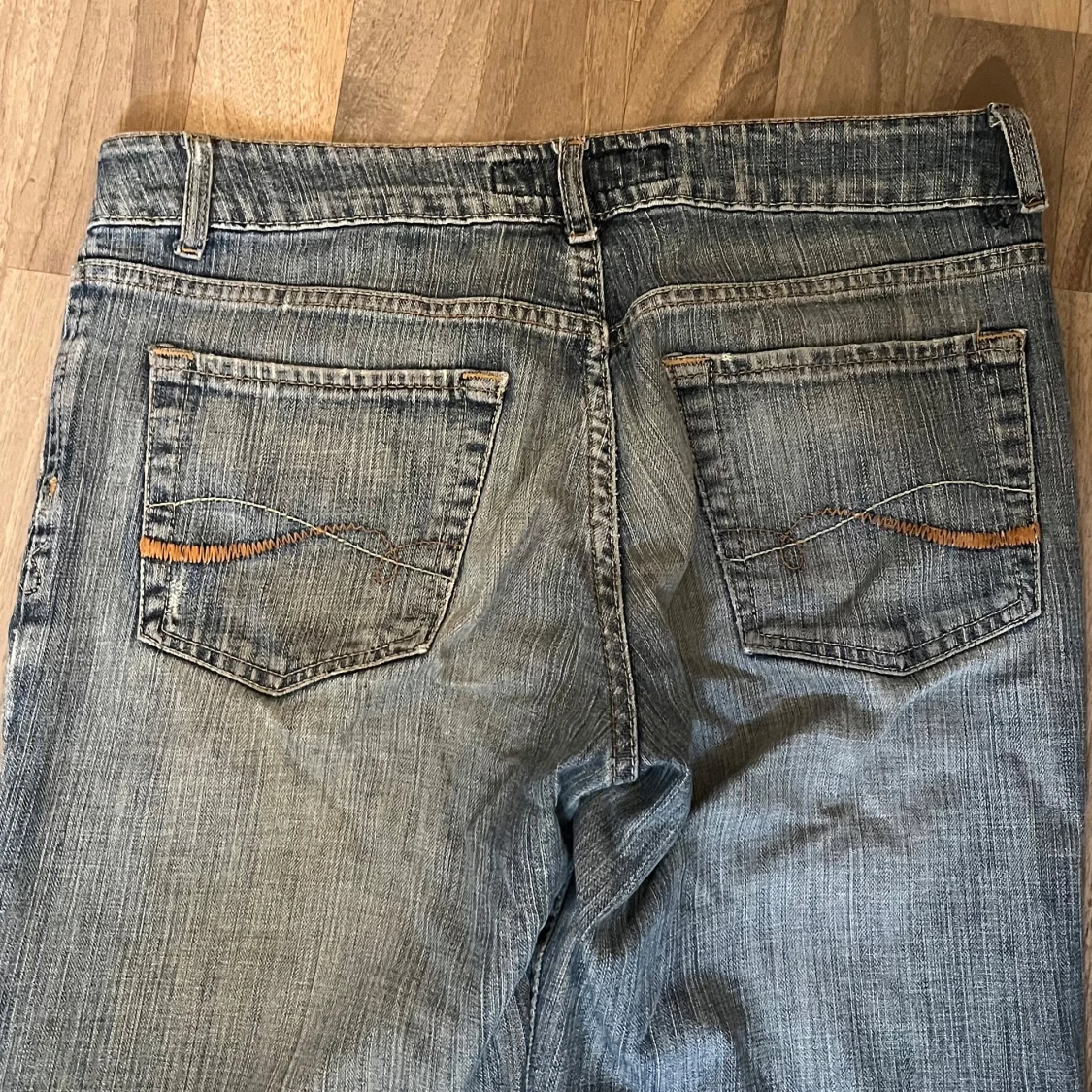 Snygga blå jeans med bootcut passform. Jeansen har klassiska fem fickor, orange söm på bakfickorna. Håll som man ser på en av bilderna sen är dragkedjan sydd då den gick i sönder tyvärr.
