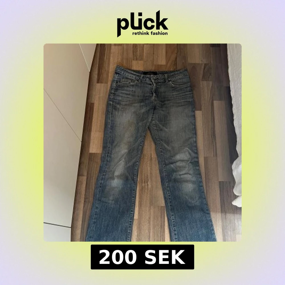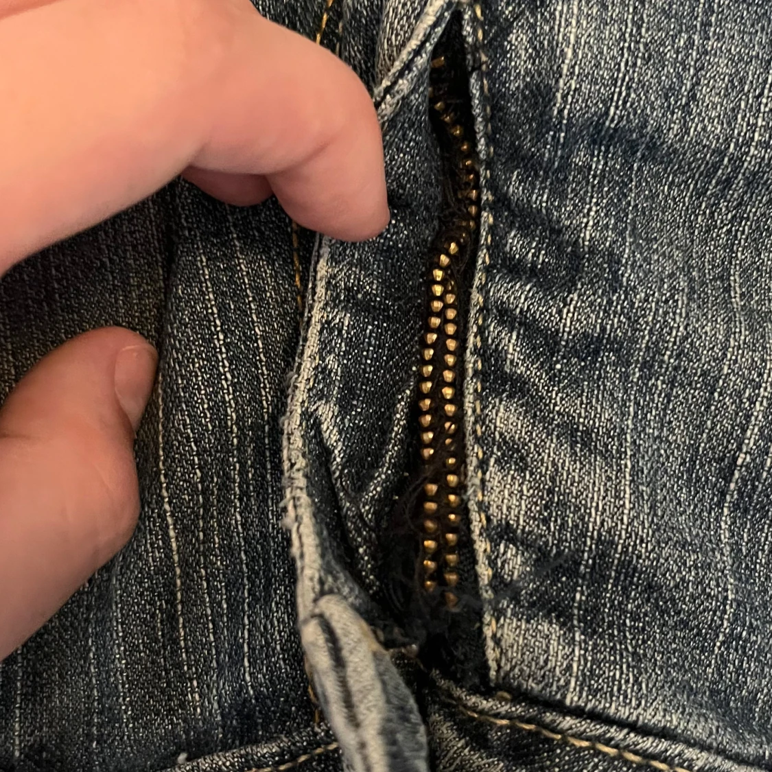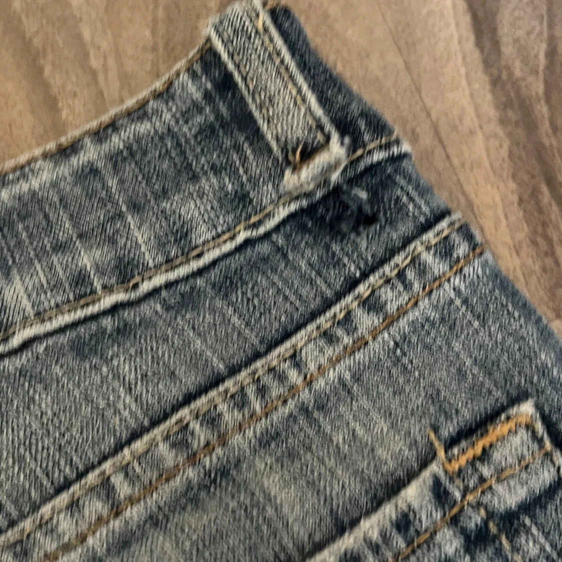 Snygga blå jeans med bootcut passform. Jeansen har klassiska fem fickor, orange söm på bakfickorna. Håll som man ser på en av bilderna sen är dragkedjan sydd då den gick i sönder tyvärr.