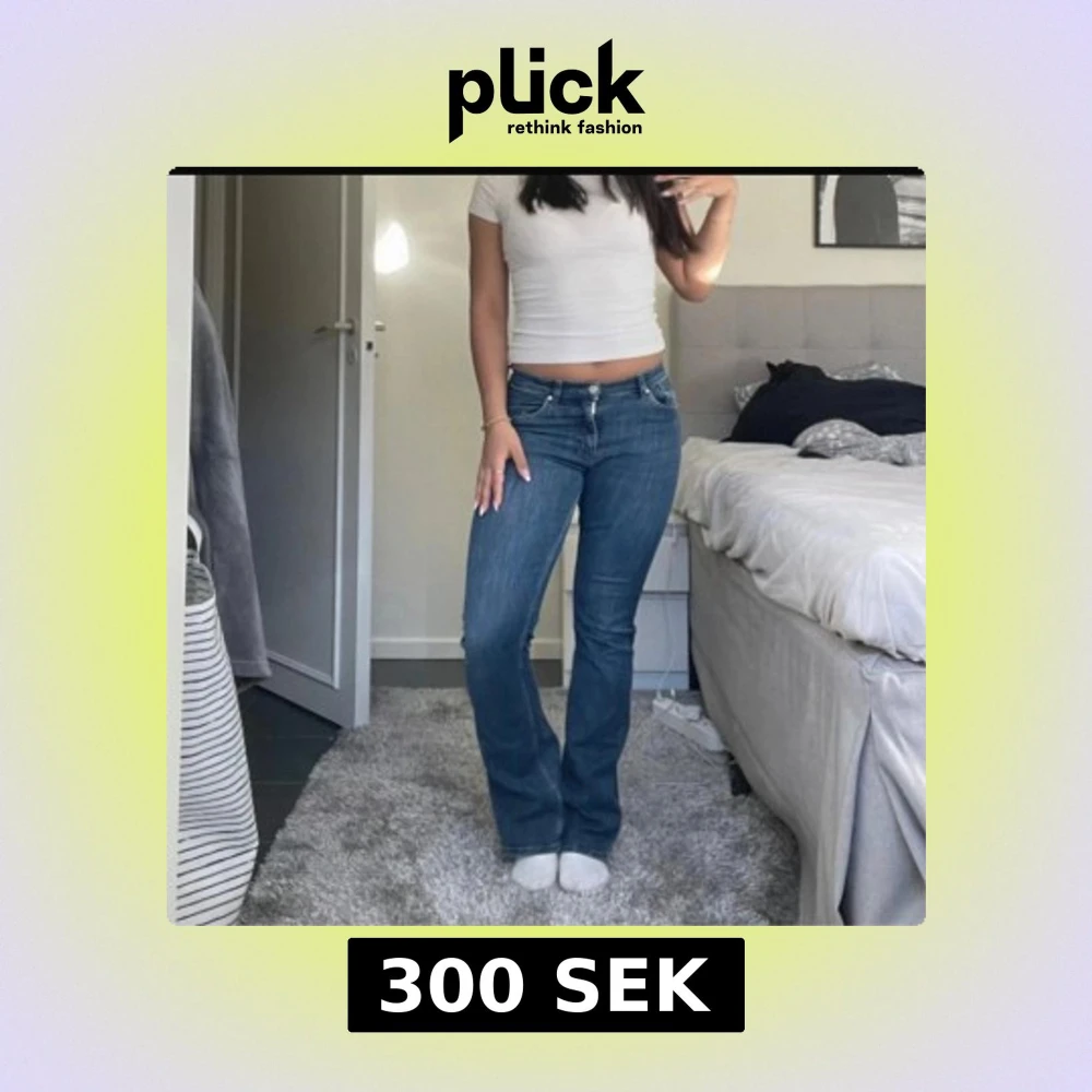 Säljer ett par klassiska blå bootcut jeans med normal passform. Bilderna är lånade från tjejen jag köpte jeansen ifrån. Köpta på kids brandstore i storlek 170 så skulle sha att dom passar xs-s