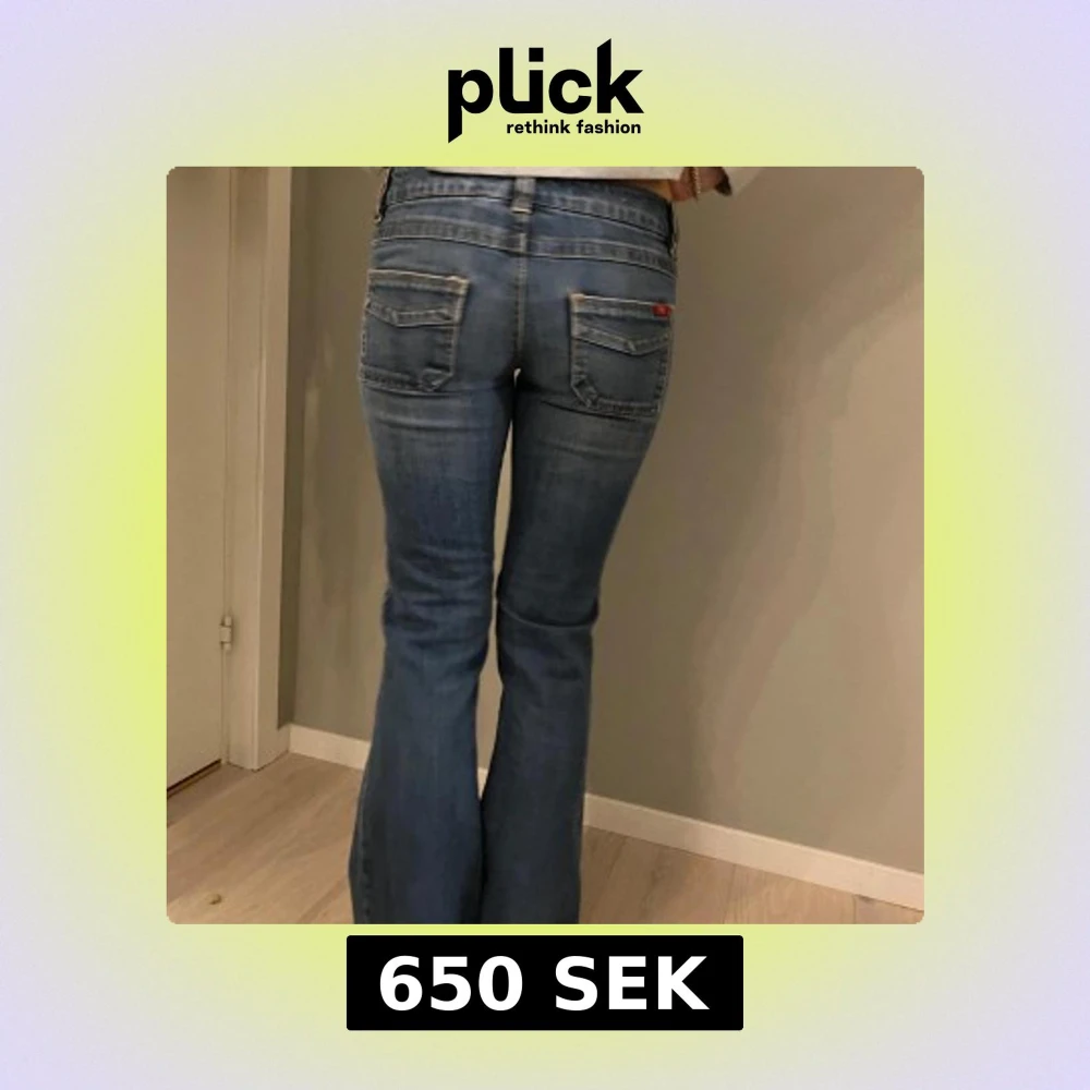 Snygga blå bootcut jeans med låg midja och klassisk femficksdesign. Perfekta för en avslappnad stil. Jeansen har en lätt tvättad look och är tillverkade i denim.
