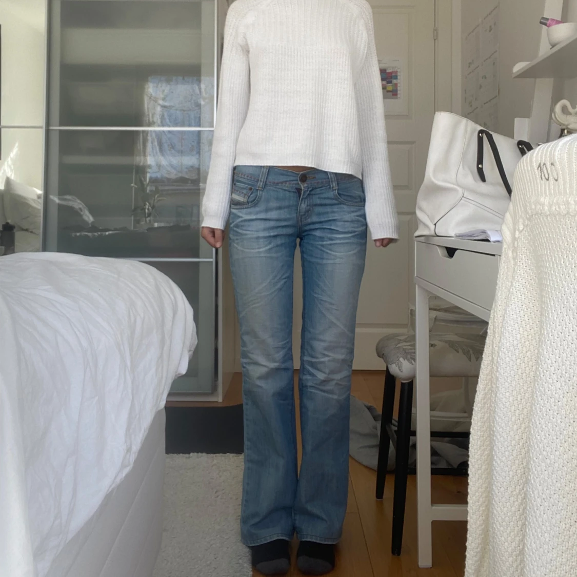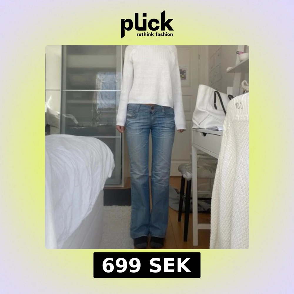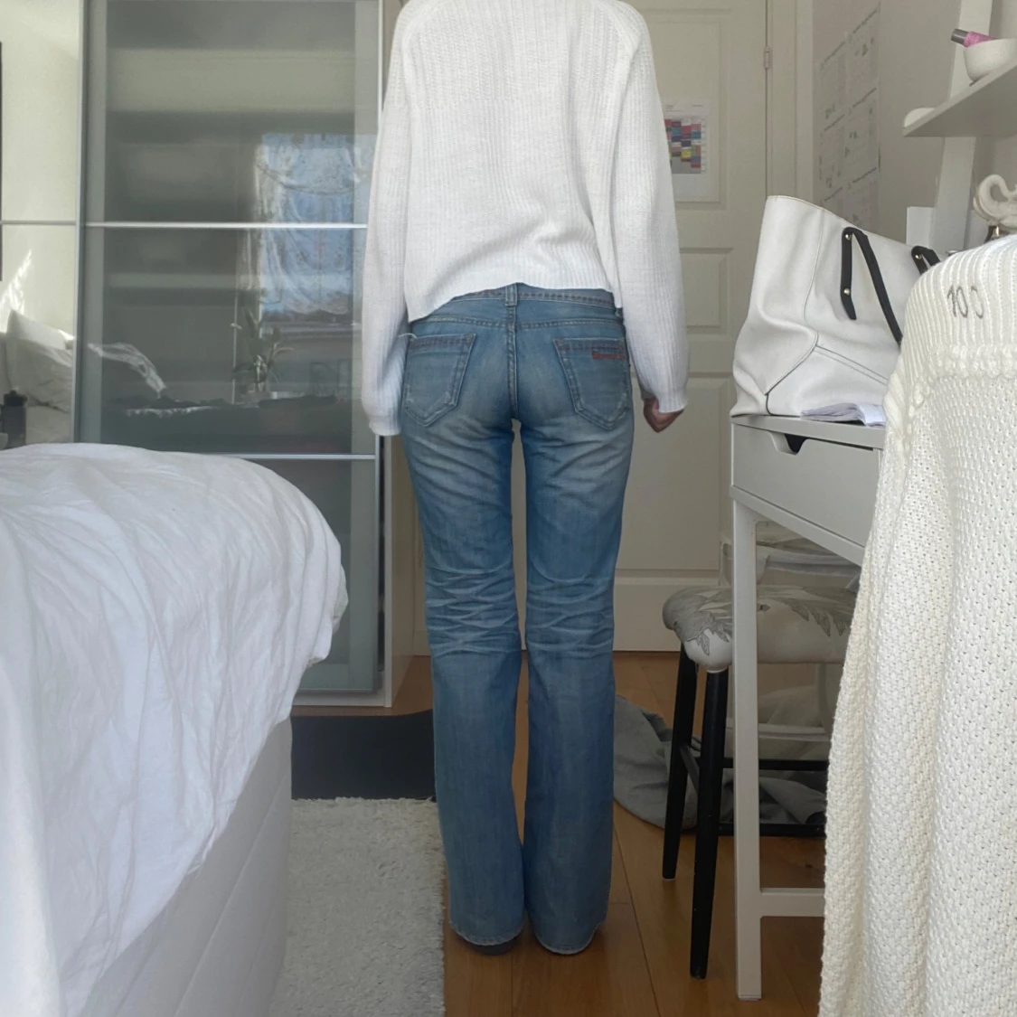 Snygga blå bootcut jeans med klassisk femficksdesign och subtila slitningar. Perfekta för en avslappnad stil. De har en normal passform och är tillverkade i jeansmaterial. Innerbenslängden:76-77cm och midjemått: 38cm💞