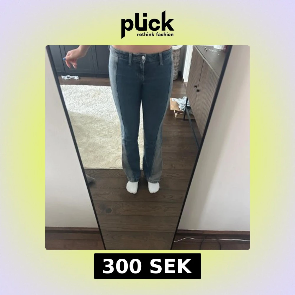 Säljer ett par blå bootcut jeans med låg midja. Från weekday , pytte lite slitna längst ner där bak. Snygg tvätt med ljusare partier längs benen och utsvängda ben.