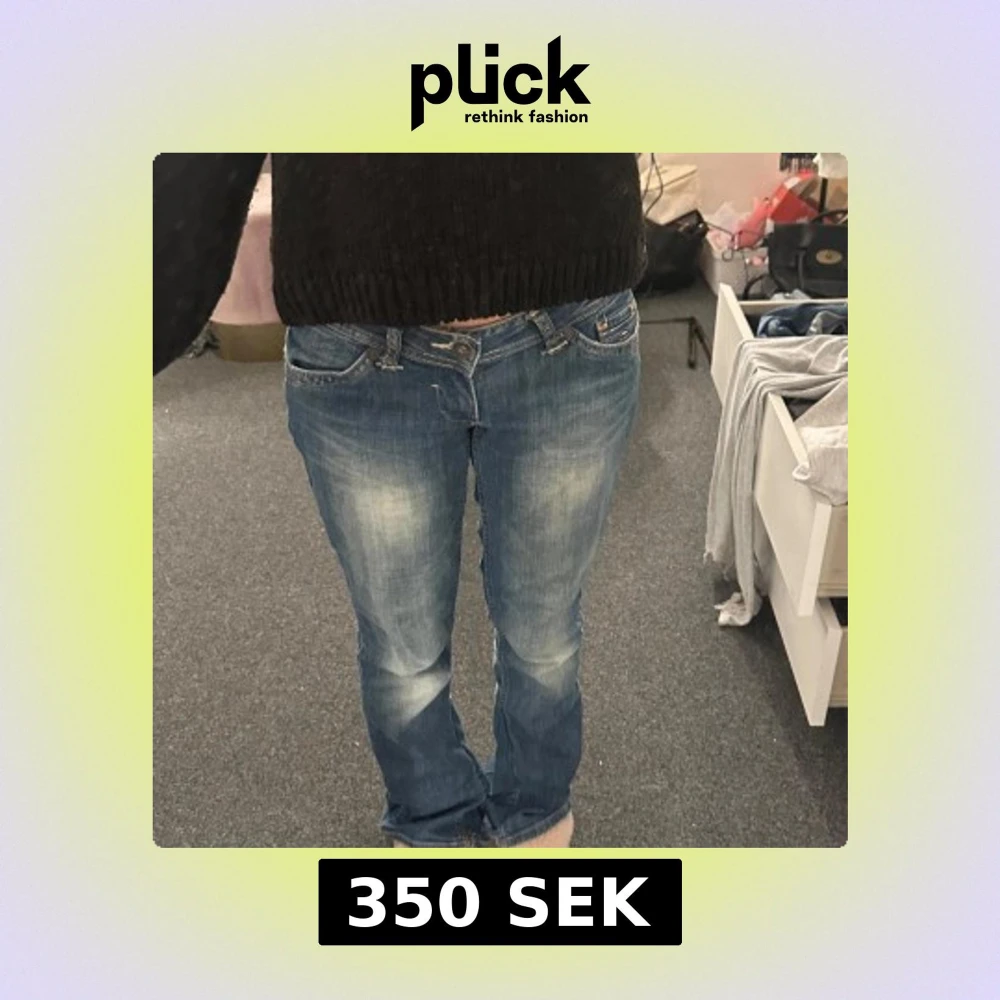 Säljer ett par snygga blå bootcut jeans i bra skick. De är lite stora på mig så de används inte, sömmen har gått upp lite där nere som man ser på bilderna