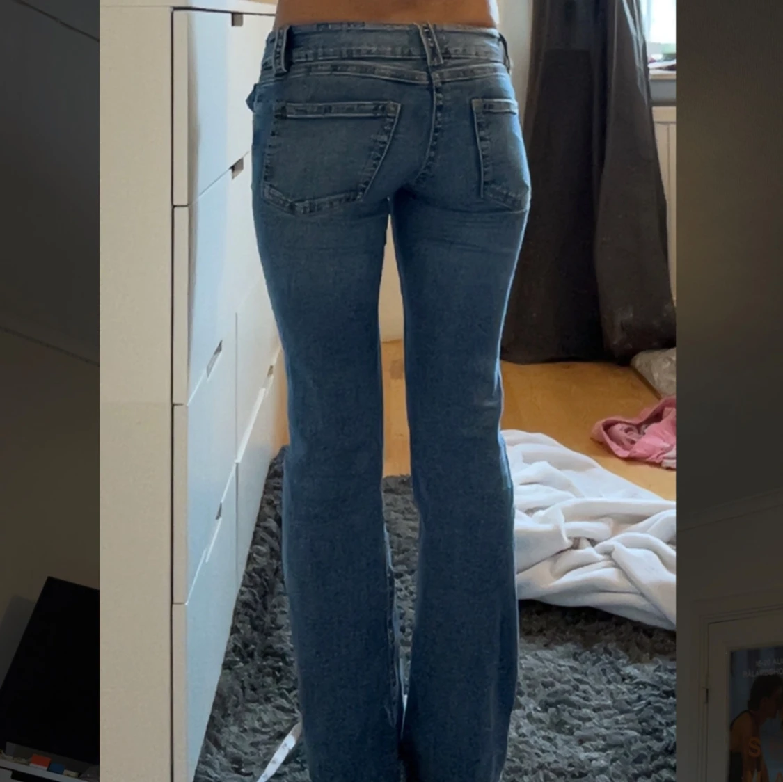 Säljer ett par klassiska blå bootcut jeans med låg midja. Jeansen har fem fickor, dragkedja och knapp framtill. Snygg passform som sitter tight upptill och släpper ut vid benen. Perfekta till sneakers eller boots. Gina tricot i storlek 158 men passar mig som är 163