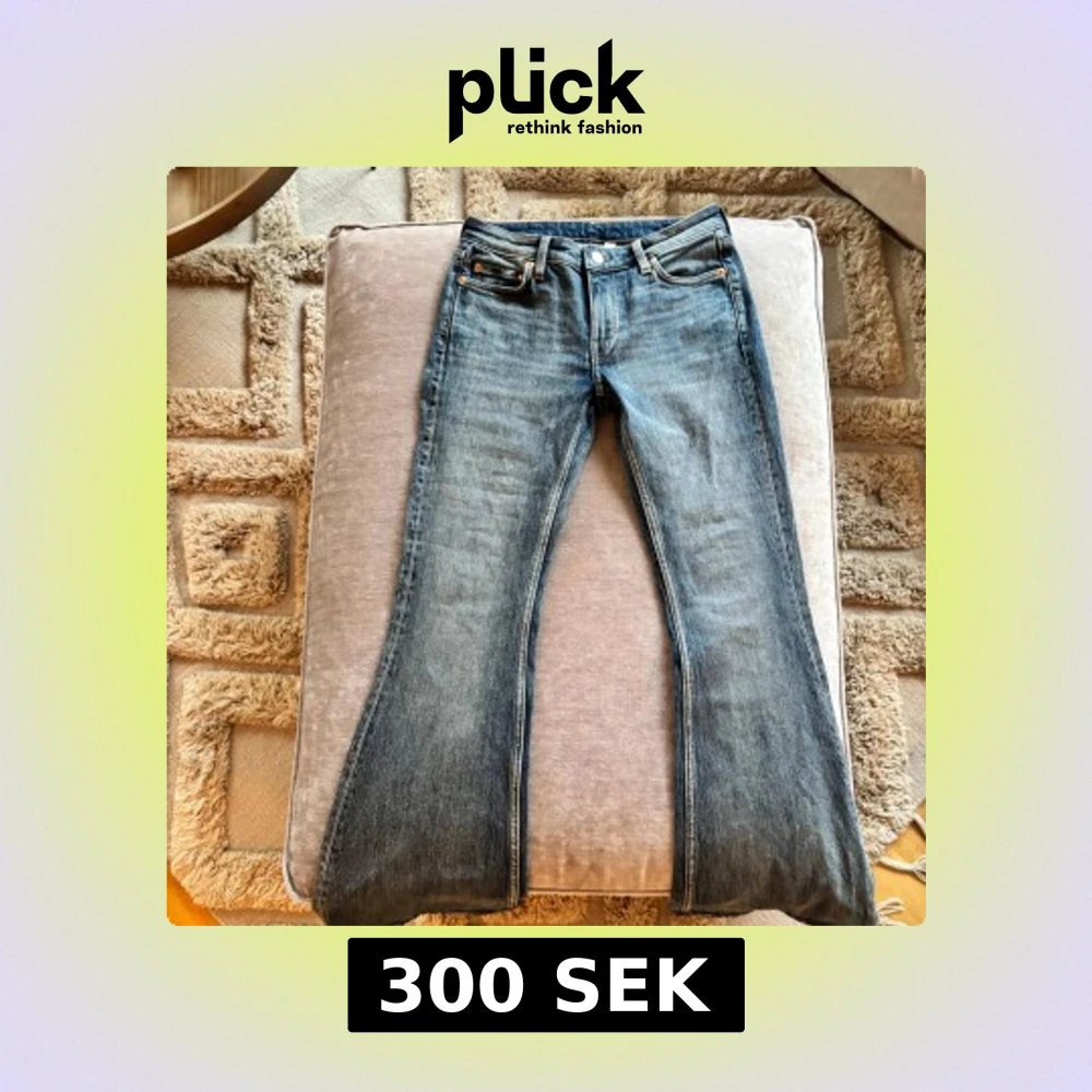 Snygga blå bootcut jeans från Weekday med klassisk femficksdesign och knappgylf. Perfekta för en avslappnad stil med en touch av retro. Passar bra till både sneakers och boots.