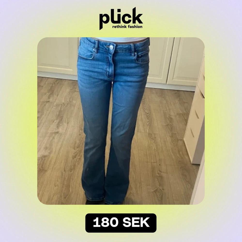 Säljer ett par blåa bootcut jeans från Gina tricot Young, de är i storlek 152 från barnavdelningen men de är stretchiga så passar större storlekar också. De är i bra skick och har inga defekter. Jeansen är midwaist💗