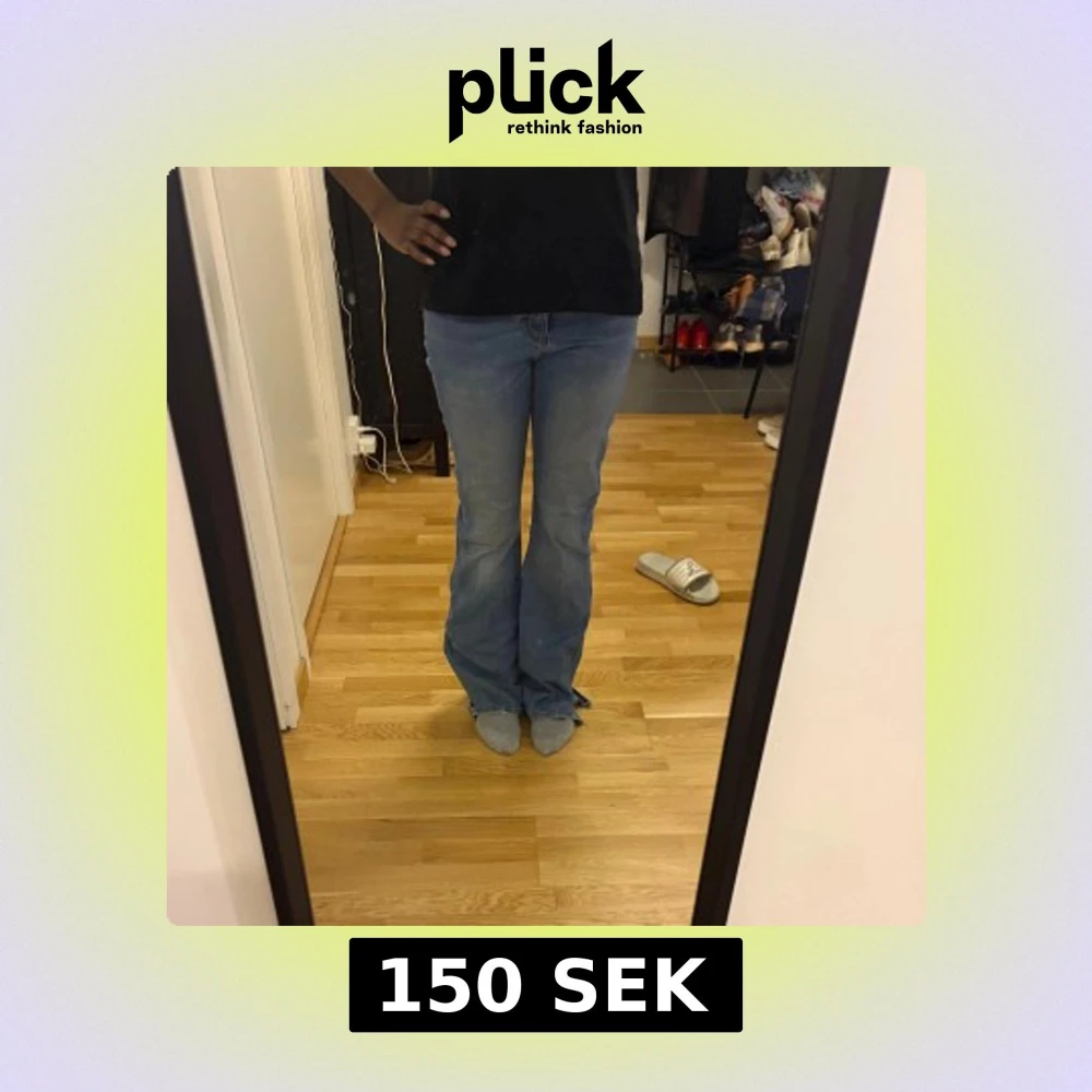 Snygga blå jeans med bootcut passform från Sara. Har gjort egna slits om sidorna, jeansen är långa på mig som är 1,67 cm lång. Storlek 38 men sitter bra på mig som bär 36! 🌸