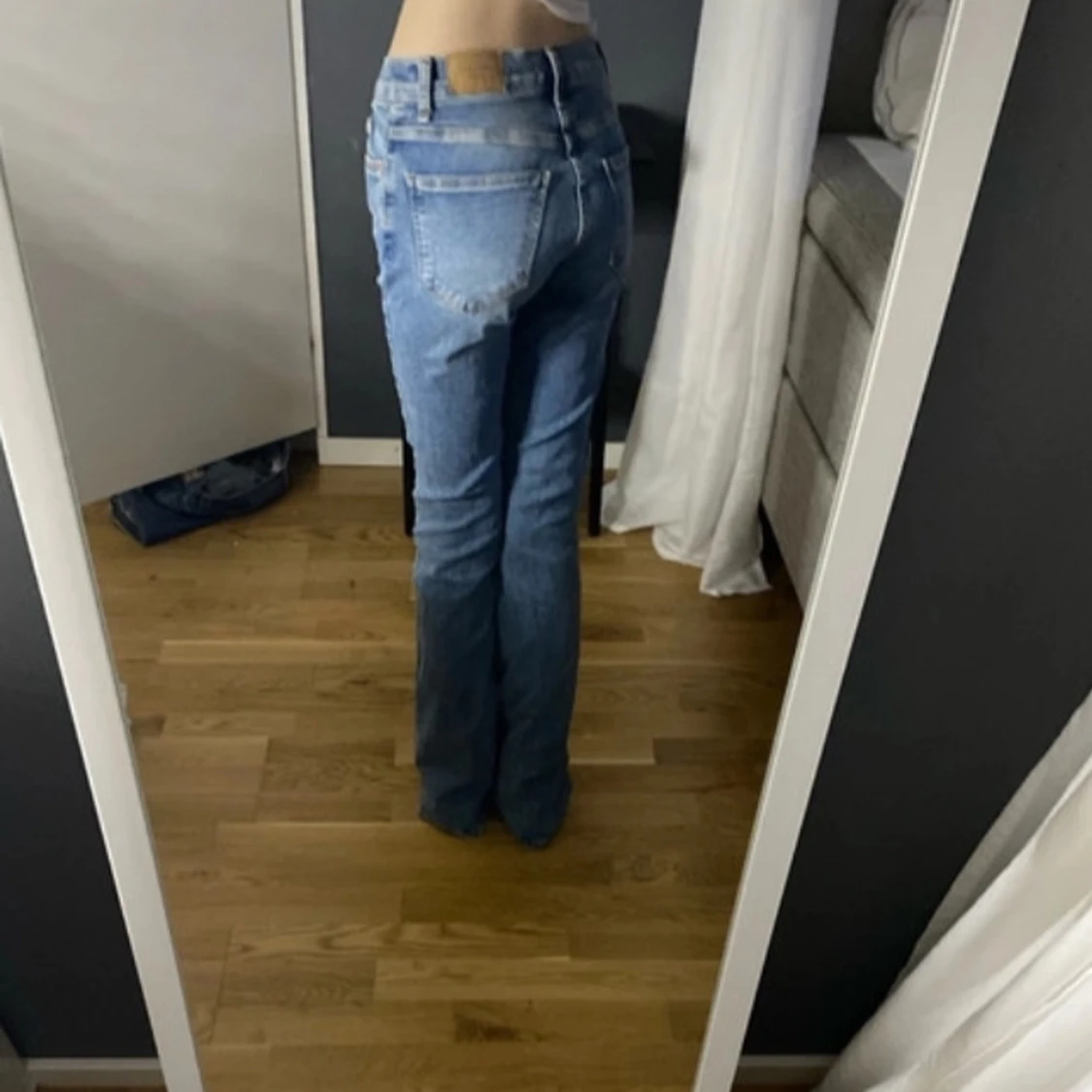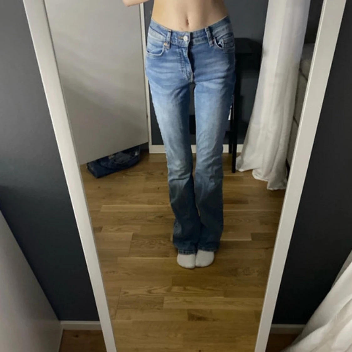 Snygga blå bootcut jeans från gina tricot. De har en klassisk femficksdesign och en bekväm passform. Perfekta för en avslappnad stil.