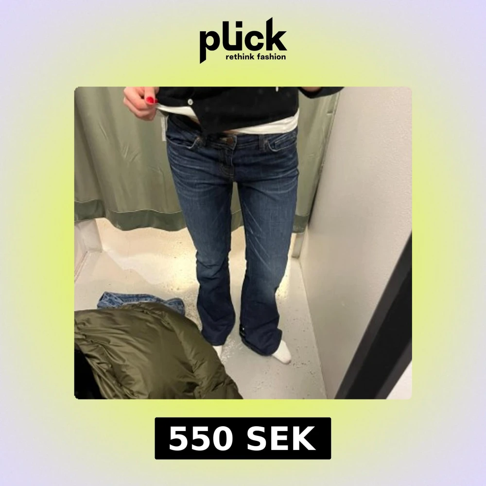 Snygga mörkblå jeans från med klassisk bootcut-passform. Jeansen har fem fickor, knapp och dragkedja framtill samt en skön midwaist. Perfekta för dig som gillar en retro vibe och vill ha jeans med lite utsvängda ben.