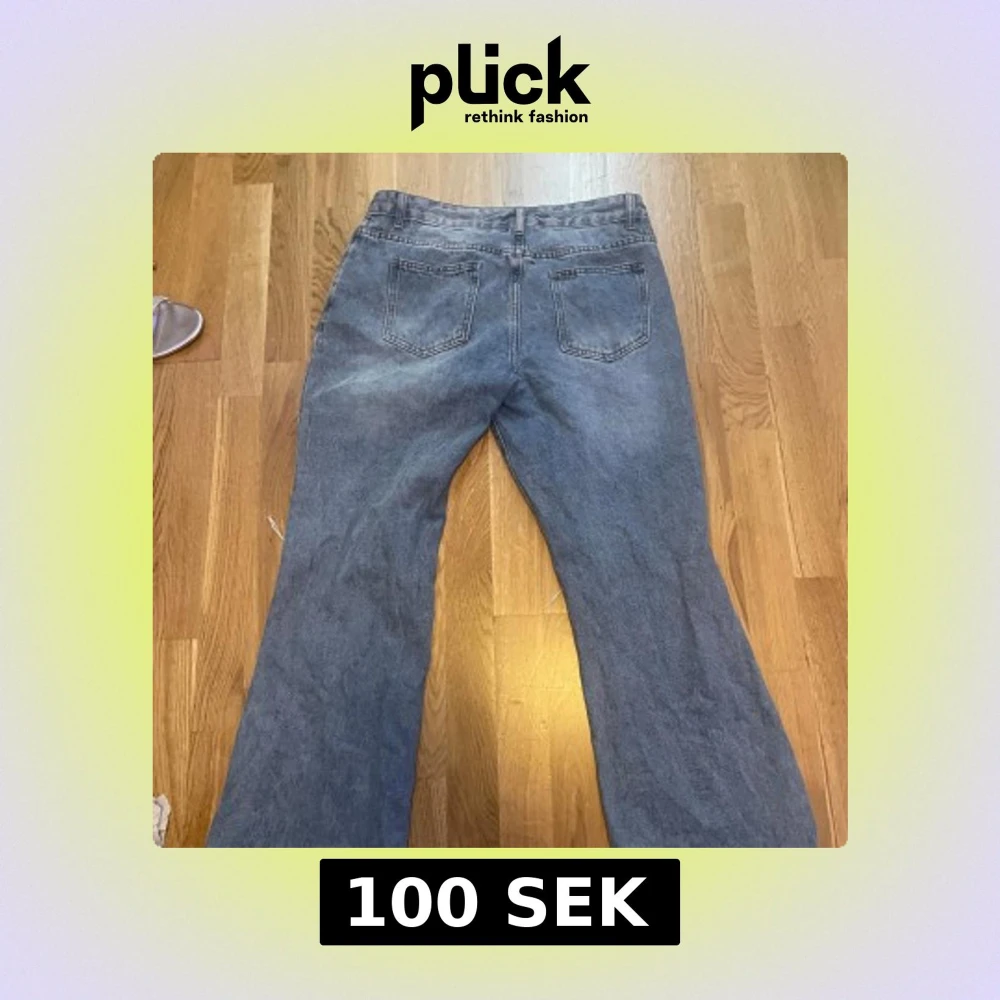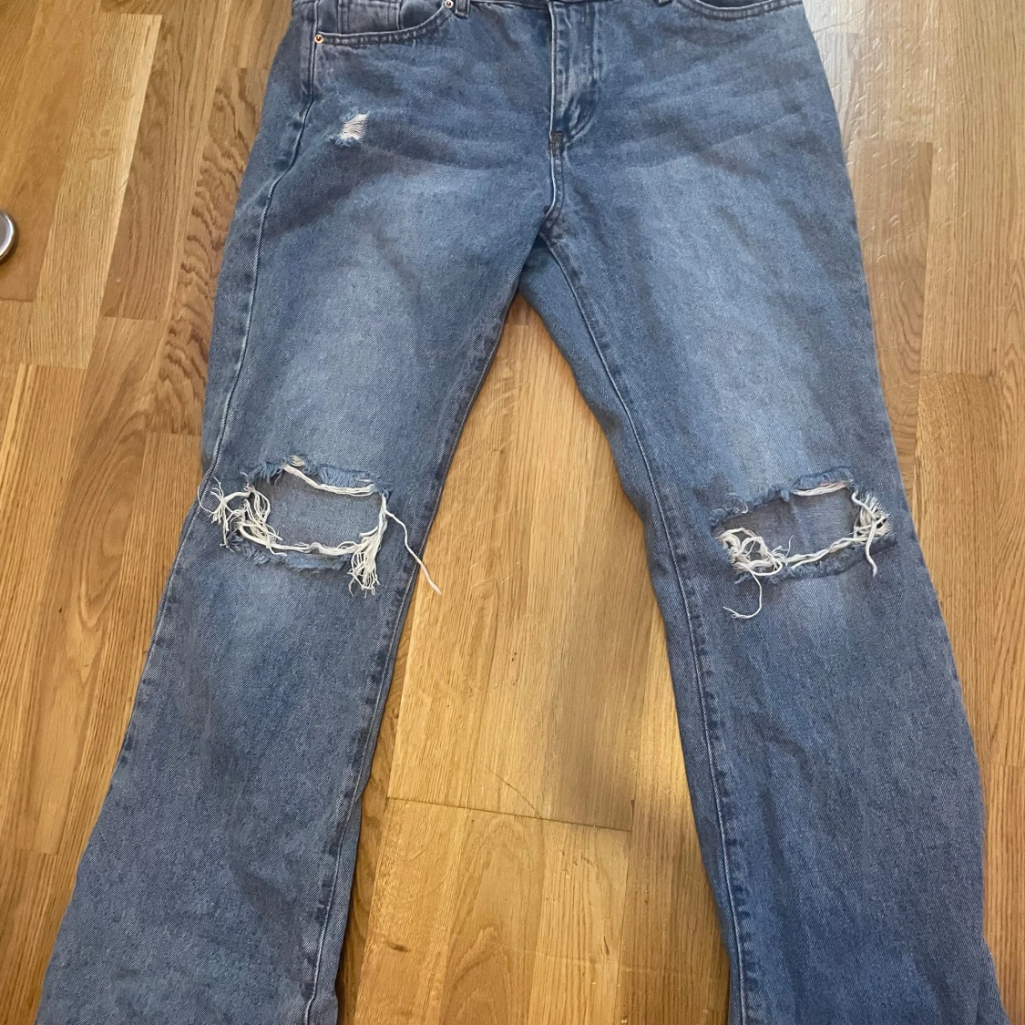 Ett par blå jeans med bootcut och slitna detaljer vid båda knäna. Jeansen har klassisk femficksdesign och är tillverkade i denim. Perfekta för en avslappnad och trendig look.