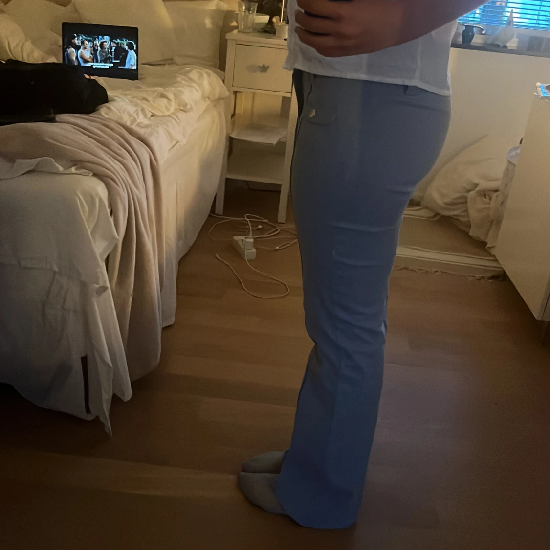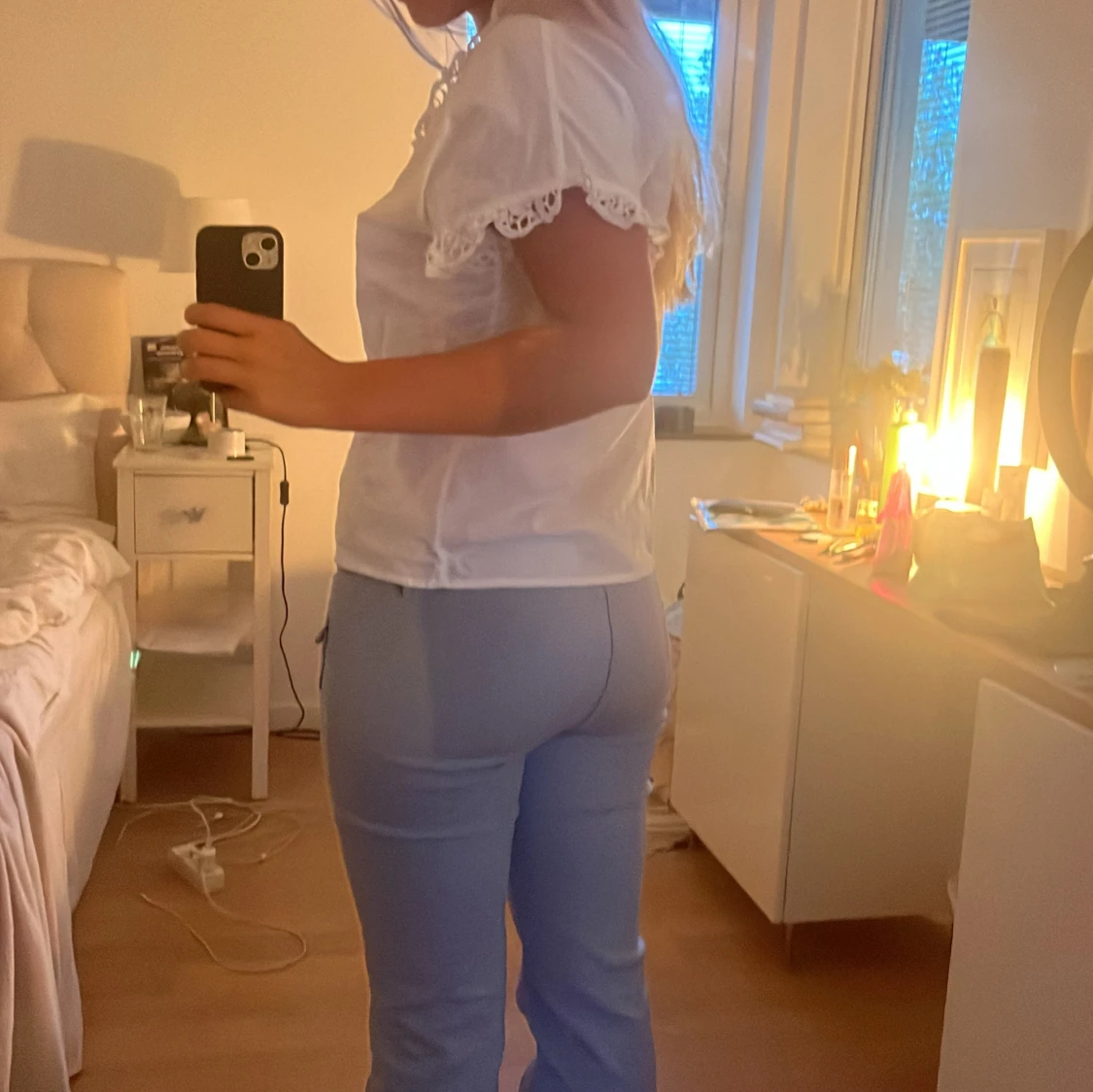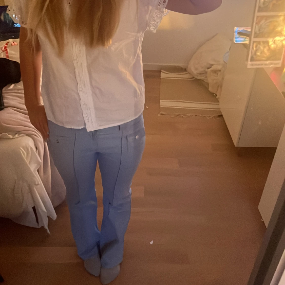 ASsnygga ljusblå byxor från hm med små fickor på framsidan. Strl 42. Sparsamt använda.