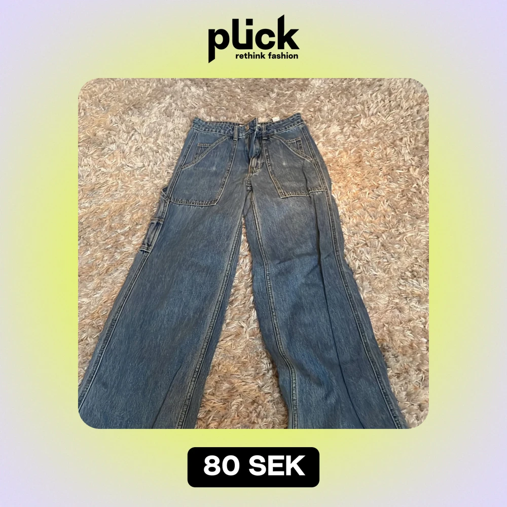 Säljer ett par snygga blå cargopants i jeansmaterial. De har en loose passform med flera praktiska fickor och en cool, avslappnad stil. Perfekta för en casual look eller en dag ute med vänner. Passar till både sneakers och boots!