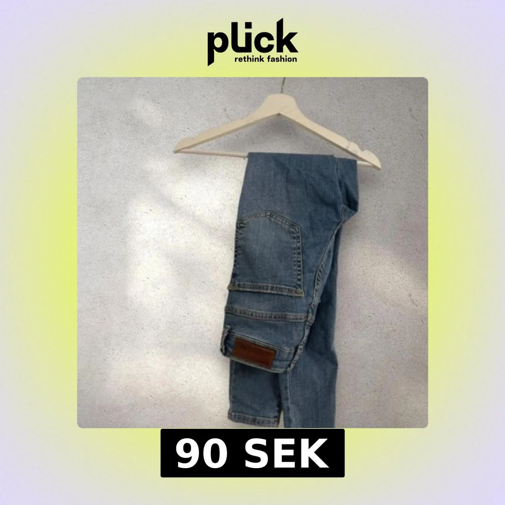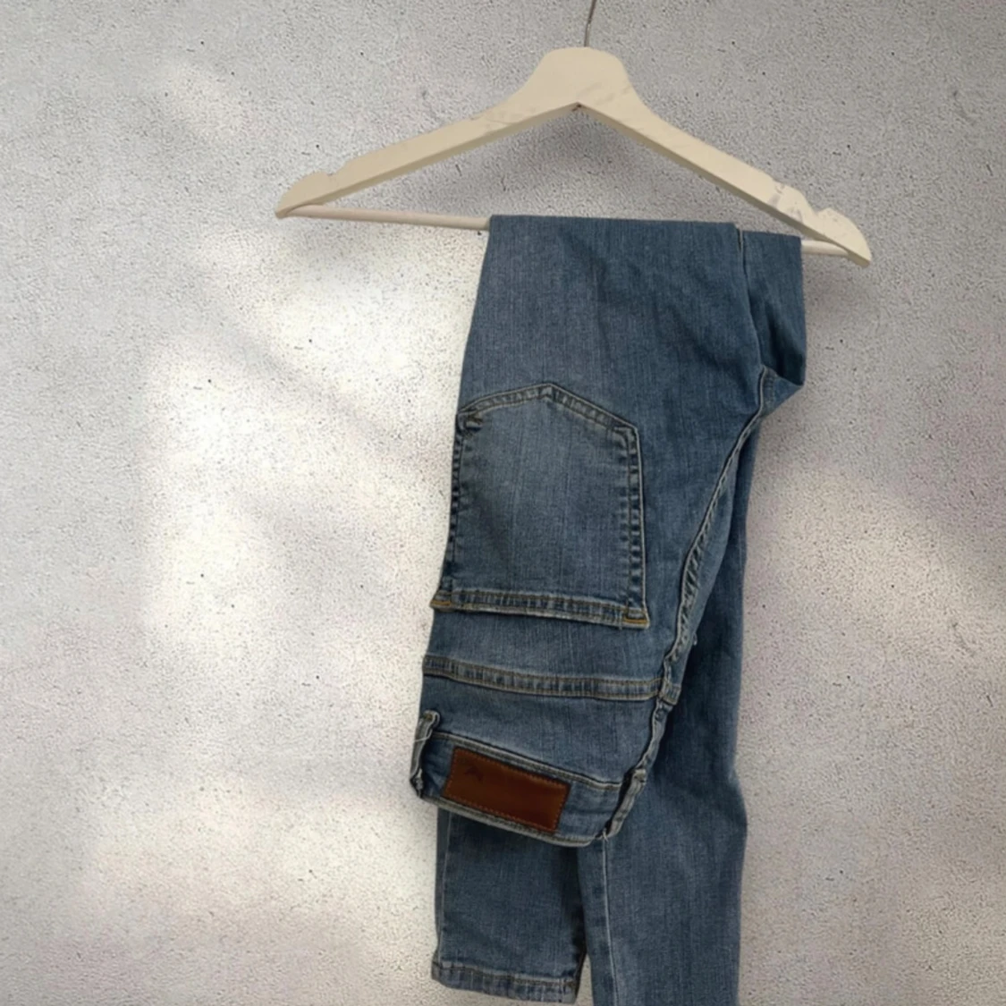 Säljer ett par blå cargopants i jeansmaterial med stora fickor på benen och en snygg läderpatch bak. Perfekta för dig som gillar streetstyle och vill ha något både praktiskt och trendigt. Klassisk blå denim med coola detaljer.
