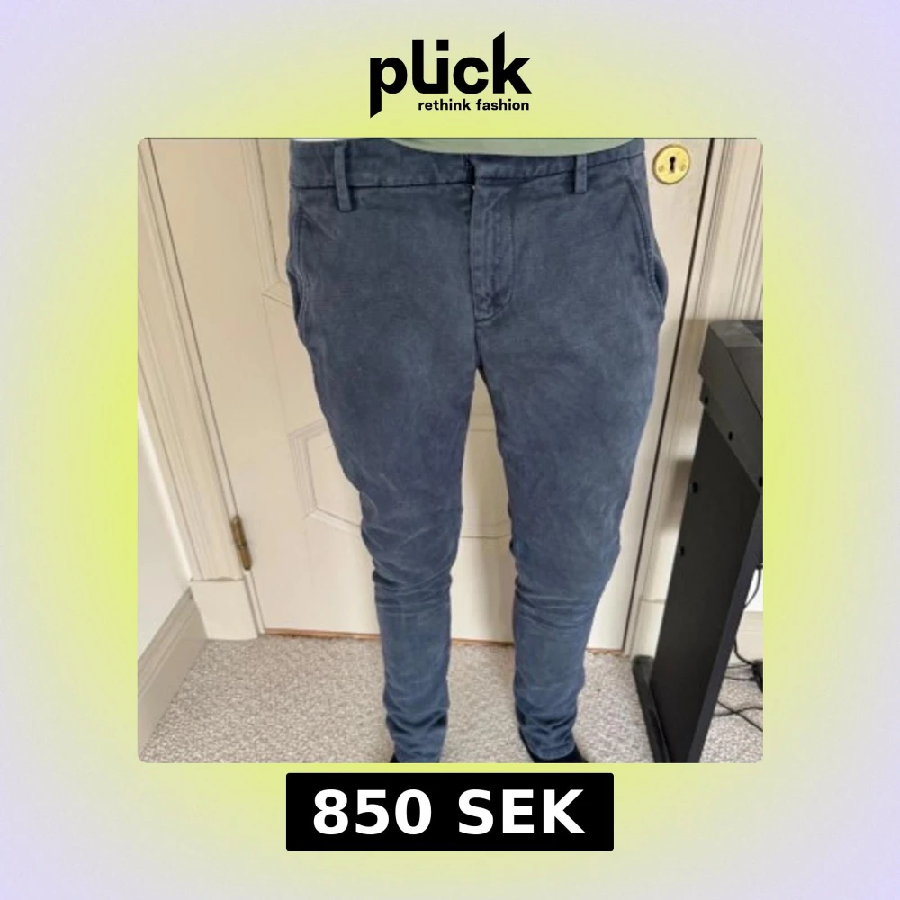 Snygga blå chinos från Dondup i storlek 29. Byxorna har slim passform, klassiska sidofickor och bakfickor med knapp. Materialet är mjukt och bomulligt, perfekt för en clean och stilren look. Metall-D vid bakfickan ger en extra detalj. Nypris 3500kr. Byxorna är använda med hänsyn och är i väldigt gott skick