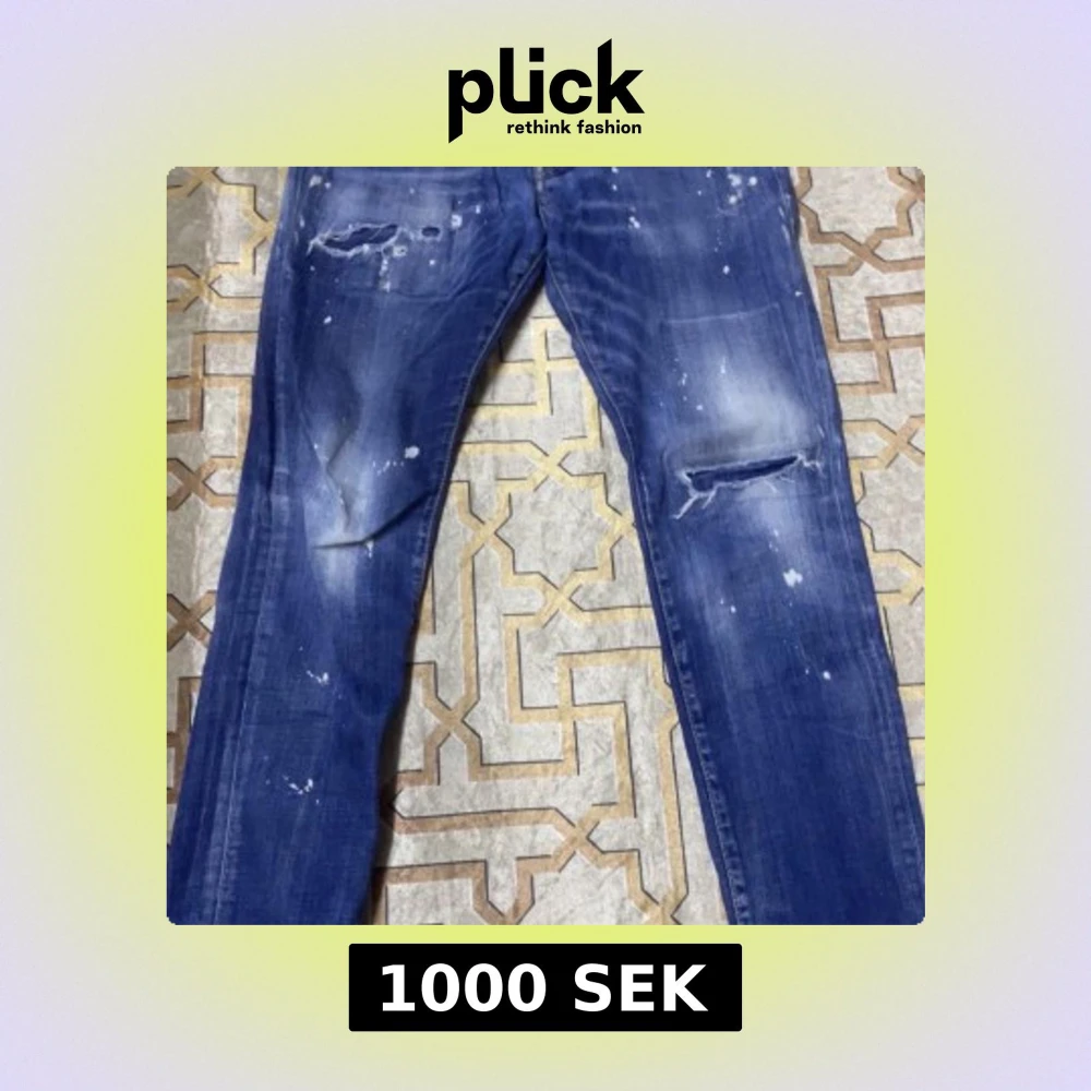 Säljer ett par blå jeans från Dsquared2 med slitningar, färgstänk och hål på benen. Jeansen har raka ben och klassisk femficksdesign. Snygga detaljer på bakfickorna och coolt tvättad look. Perfekta för dig som gillar streetstyle.