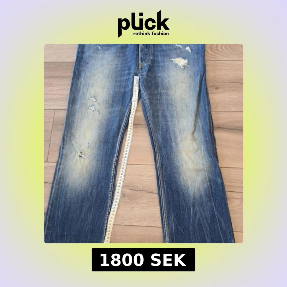 Säljer ett par blå jeans från DNA dirtynewage med coola slitningar och blekta detaljer på benen. Klassisk femficksmodell med raka ben och gul söm på bakfickorna. Jeansen har normal passform och är tillverkade i jeansmaterial.