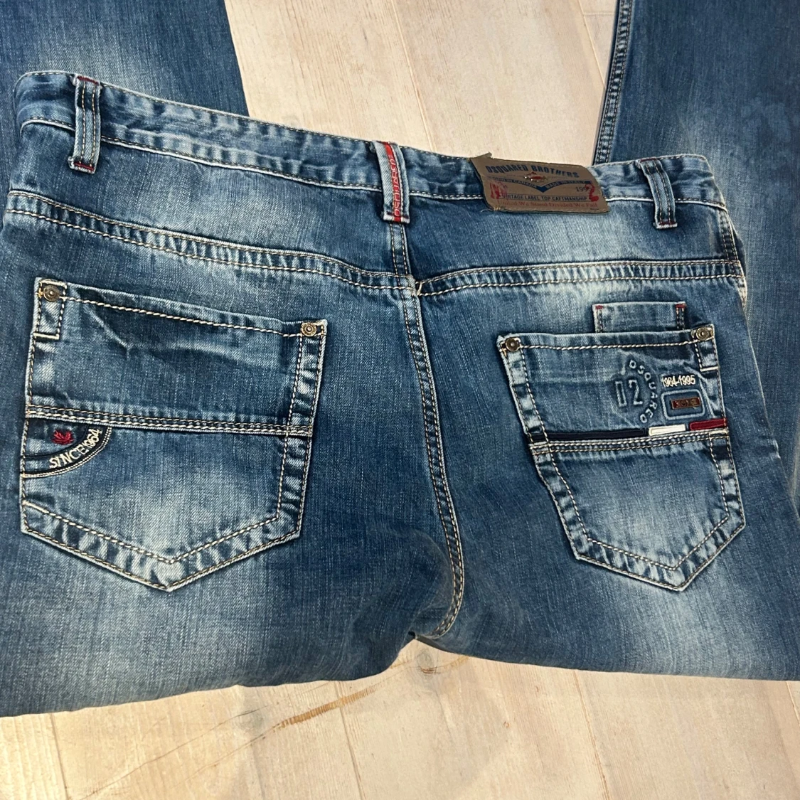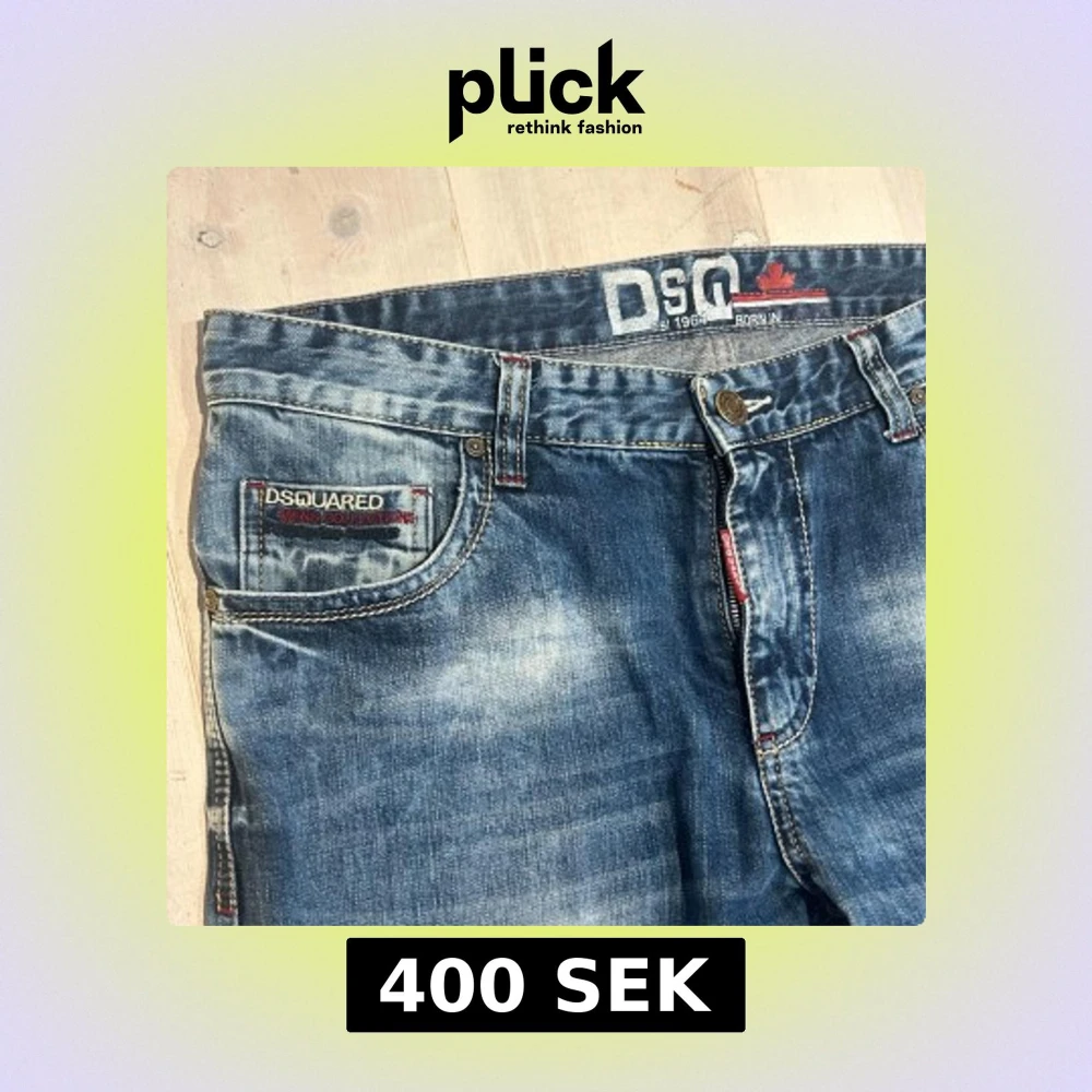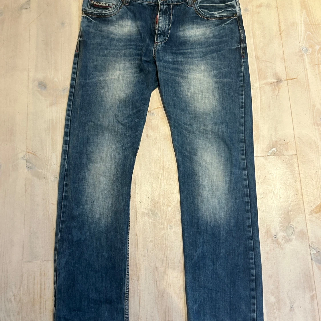 Säljer ett par blå jeans från DSQUARED2 med coola slitningar och kontrastsömmar. Jeansen har broderade och patchade detaljer på fickorna, samt röda inslag vid dragkedjan och bälteshällorna. Klassisk femficksmodell i mjukt denimtyg.