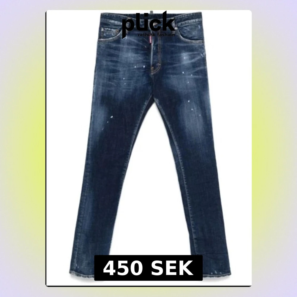 Säljer ett par blå jeans från DSQUARED2 med coola färgstänk och slitningar. Storlek 50 passar mig som är 185 och väger 78 men lite stora vid midjan