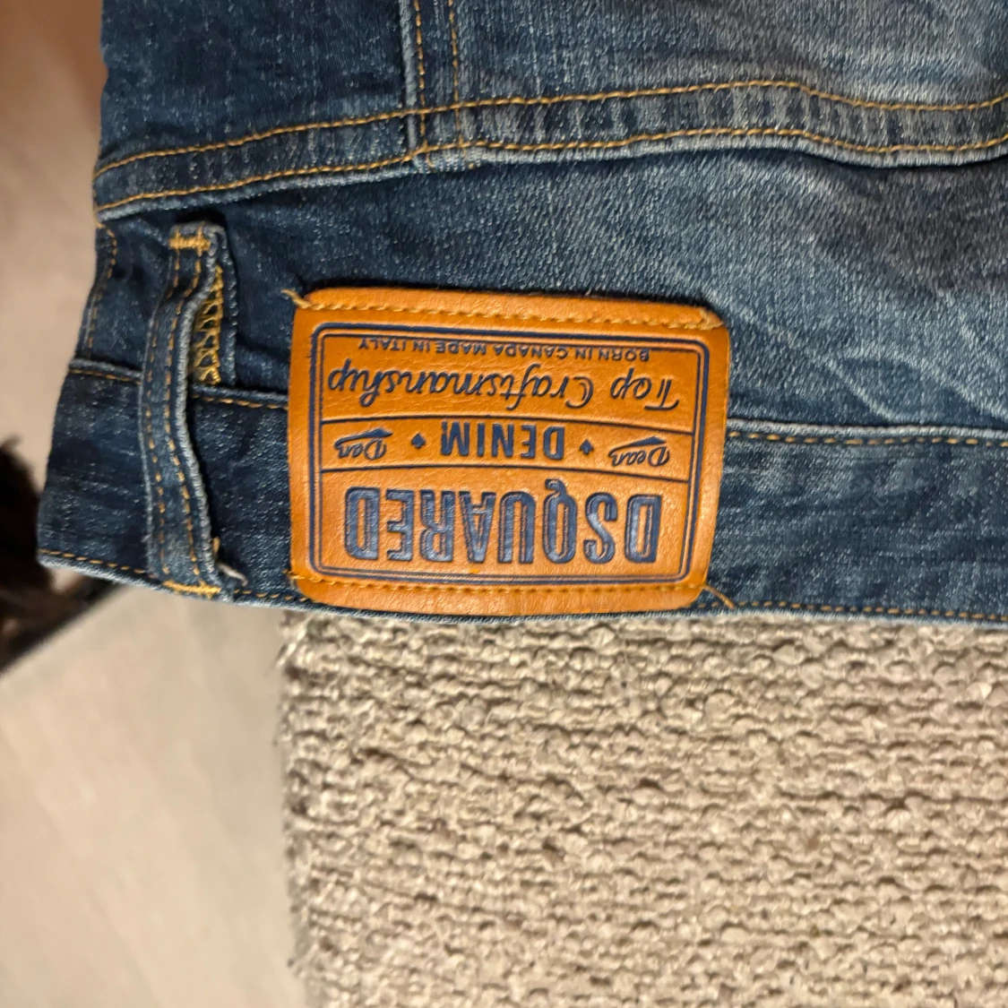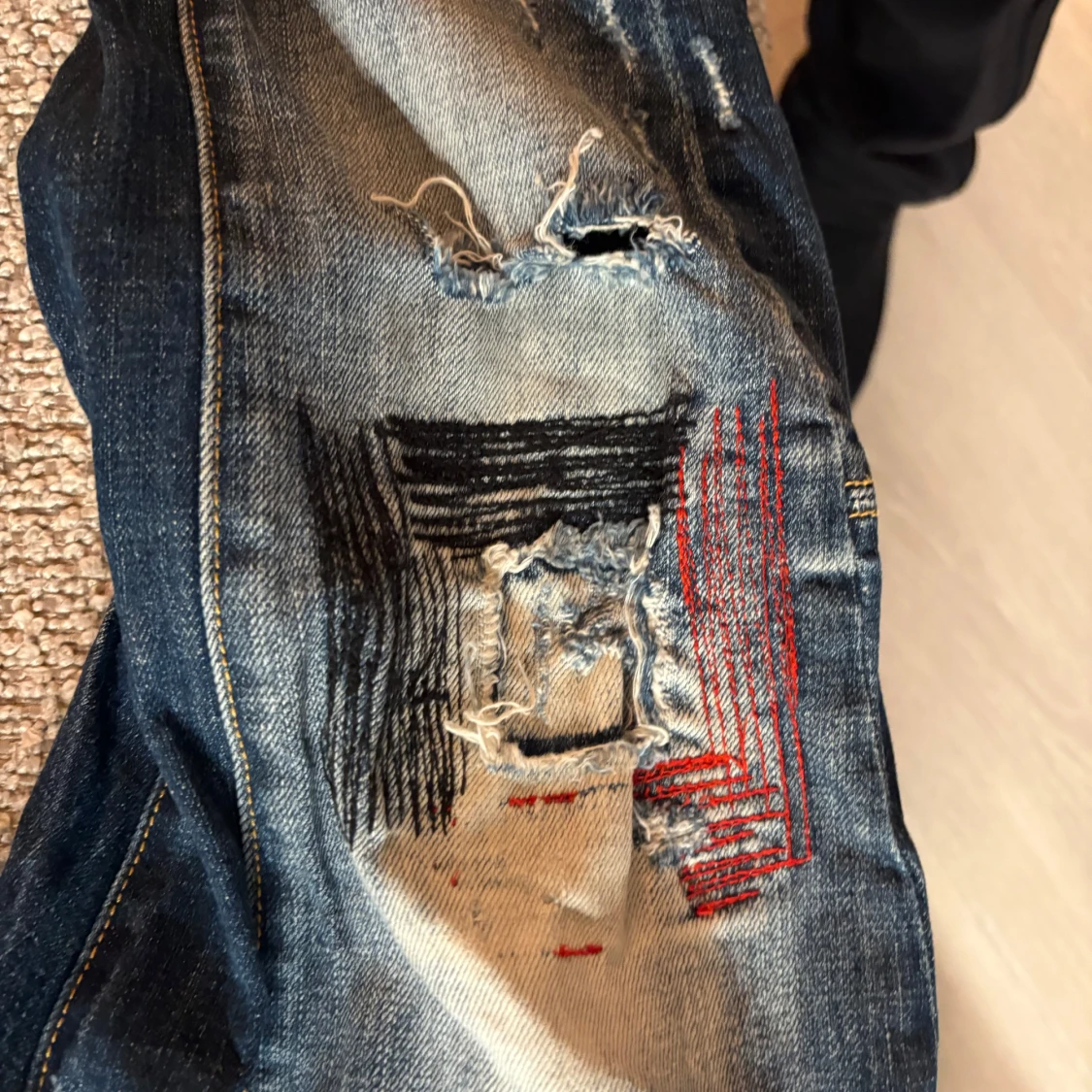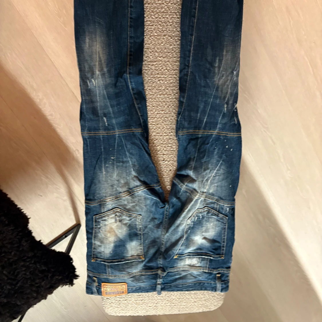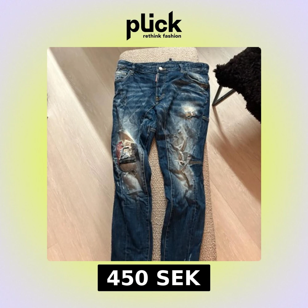 Säljer ett par blå jeans från Dsquared2 med coola slitningar, patchar och detaljerade sömmar. Jeansen har en klassisk femficksdesign, tydliga slitna partier och en snygg Dsquared2-label bak. Passar dig som gillar street och edgy stil.