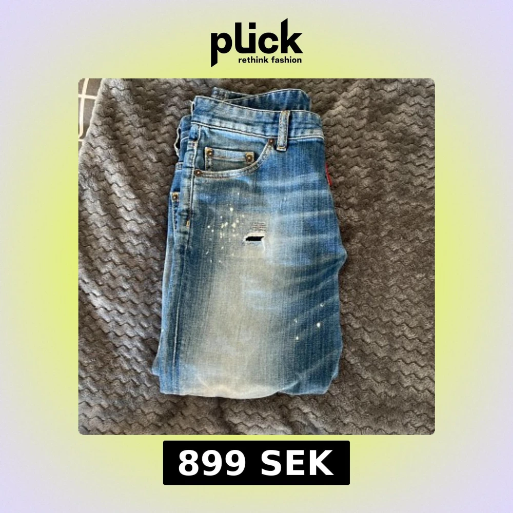 Säljer ett par blå jeans från Dsquared2 med lite slitningar. Jeansen har klassisk femficksdesign, knappgylf och patch på bakfickan. De har en något tvättad look och är raka i modellen. Storleken är W27-28 sitter jättebra på båda. L30 ny pris cirka 3000 mitt pris 899. Hör av er vid minsta fundering. Pris går att diskutera!