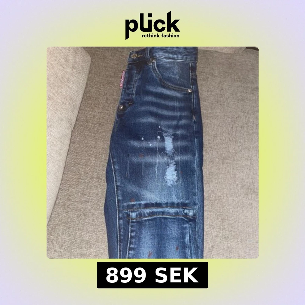 Snygga blå jeans från Dsquared2 med coola slitningar och färgstänk på benen. Klassisk femficksmodell med Dsquared2-logga på fickan och bak. Jeansen har en modern passform och detaljer som ger en trendig look.