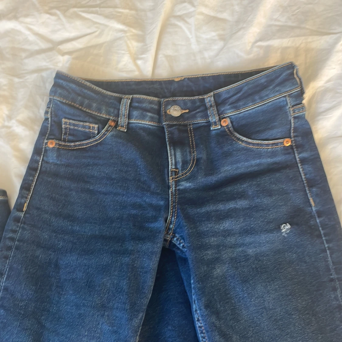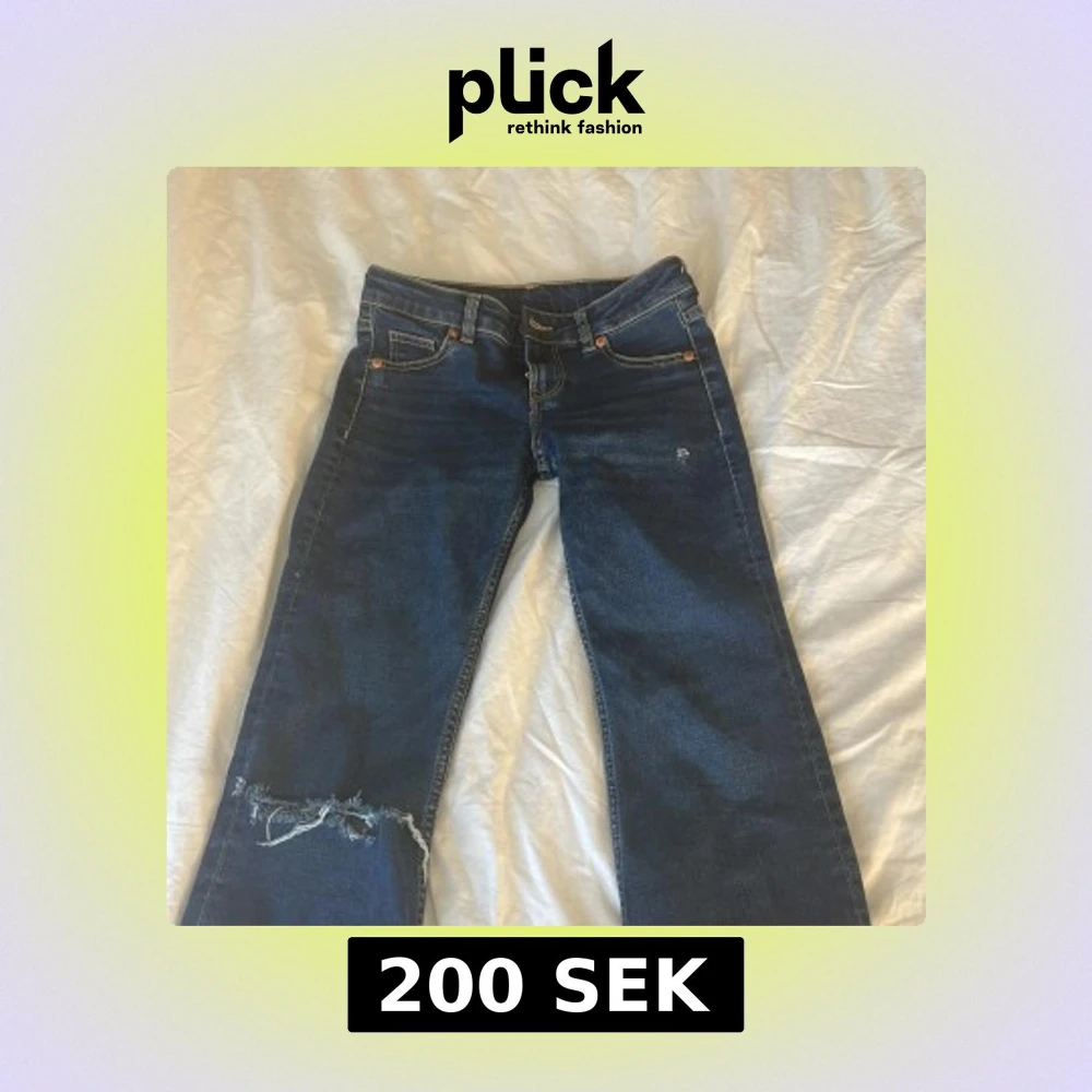 snygga utsvängda lågmidjade jeans från H&M. Säljer pga att jag inte använt dom på ett tag. använde dom inte särskilt mycket förut heller kanske max 10 gånger. Väldigt bra skick, hålet är gjort själv!💘 passar mig i längden som är 167 så skulle säga passar bra på folk runt 165-170! Storlek 32/XS🥰