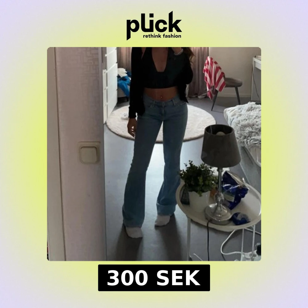 Säljer ett par ljusblå bootcut jeans från Gina Tricot. Jeansen har en snygg utsvängd passform och är tillverkade i mjukt denimtyg. Säljer på gå grund av att de inte kommer till användning längre💗