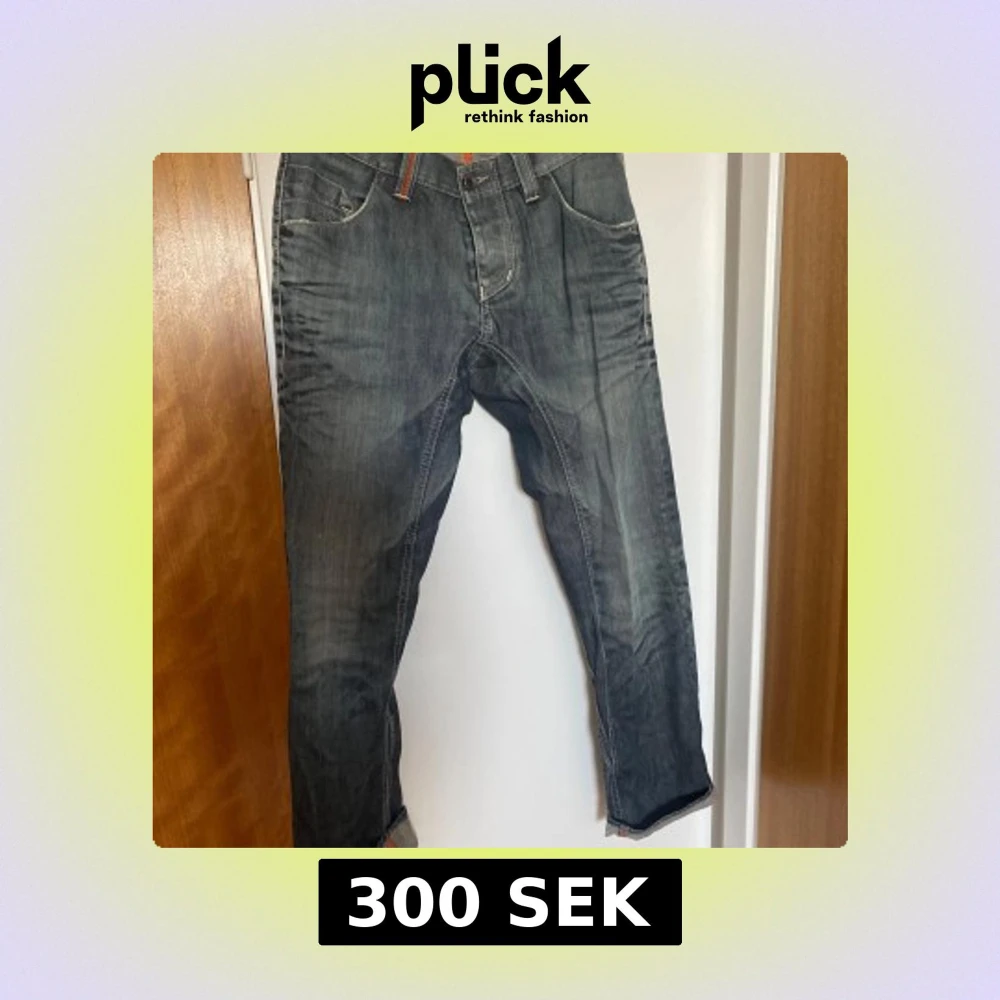 Säljer ett par blå jeans från BOSS Orange med orangea kontrastsömmar och knäppning med knappar. Jeansen har regular fit, klassiska bakfickor och en snygg läderpatch med logga bak i midjan.