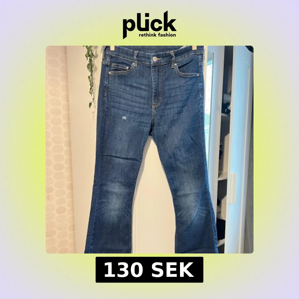 Snygga blåa high waisted flared jeans i storlek 40. Går med vilken outfit som helst och dessa är rätt så mjuka. Dock har den gått sönder lite grann ( tredje bilden visar lite mer noggrant) men är inget men märker av och tycker det ser skumt ut. Vet inte vart denna är ifrån