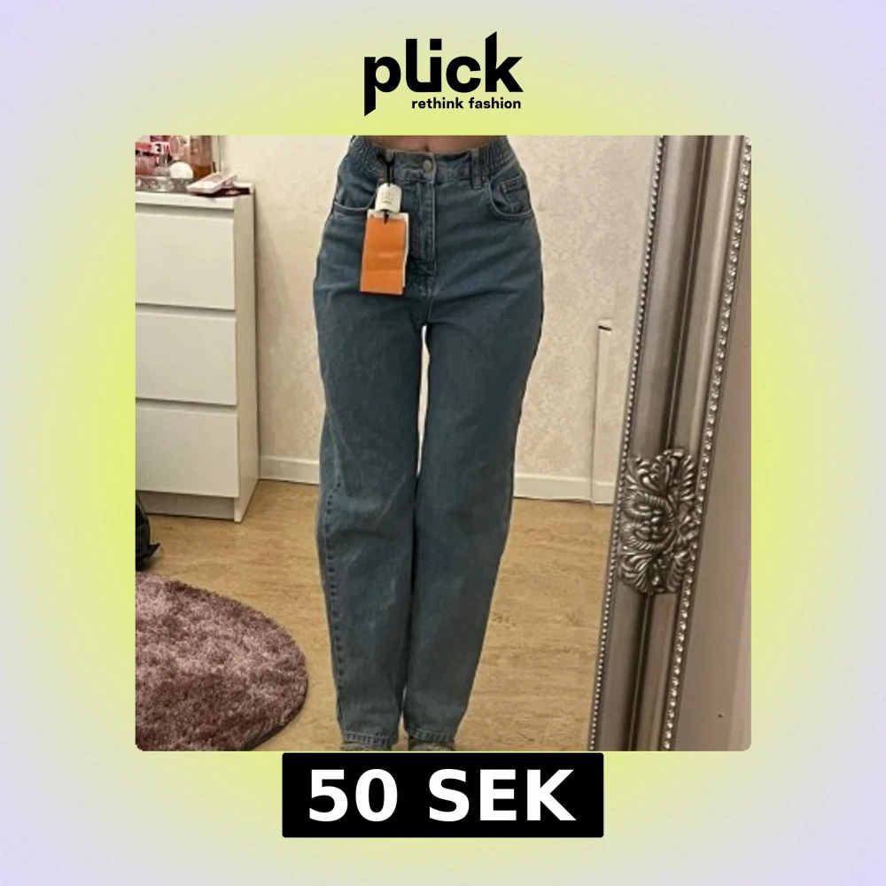 Snygga blå jeans med hög midja i rak design. Från pull&bear, endast testade, säljer pga inte hann returnera. Strl 32 men passar som 34. PM för fler bilder