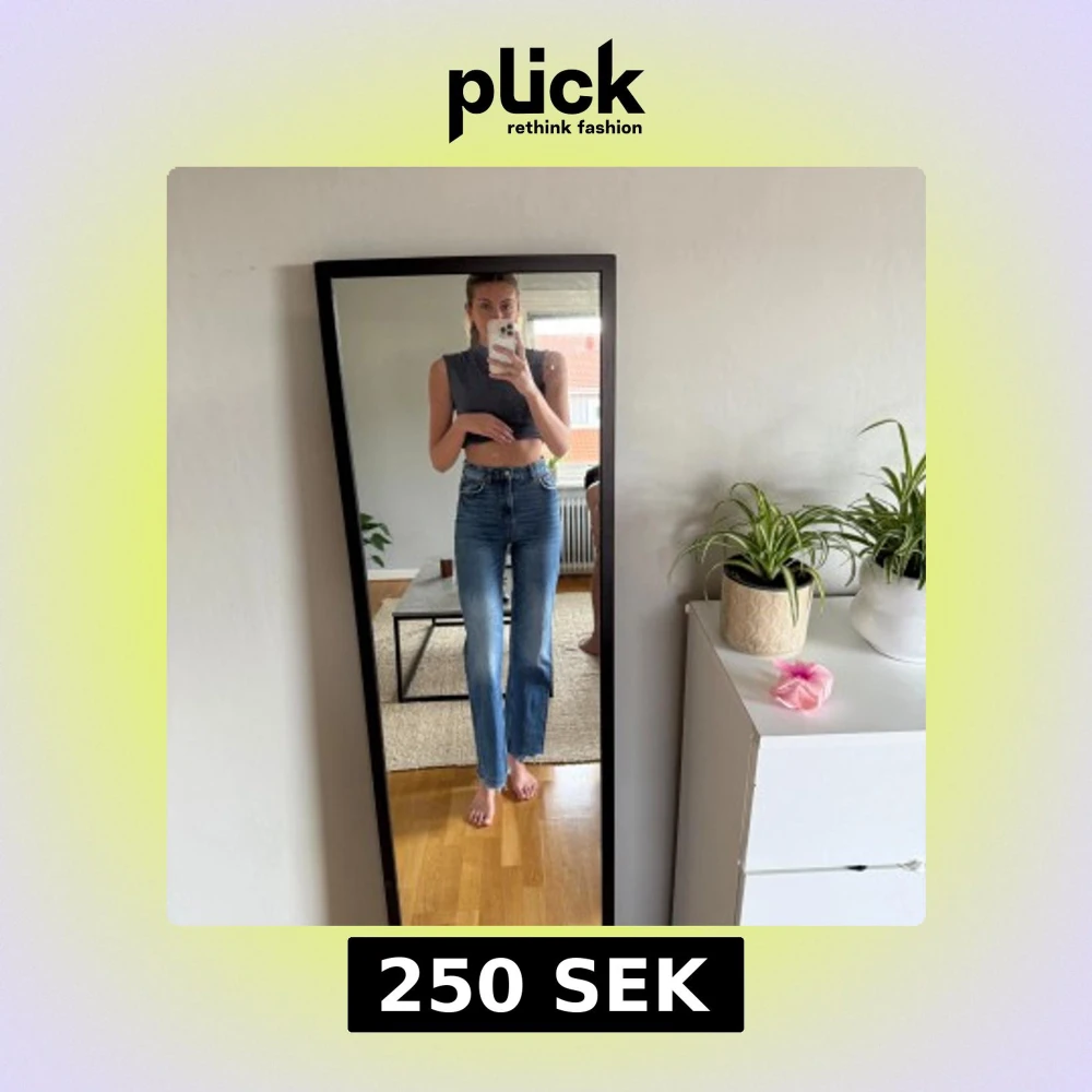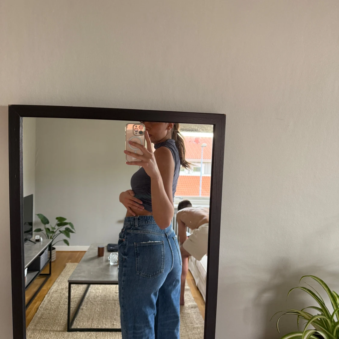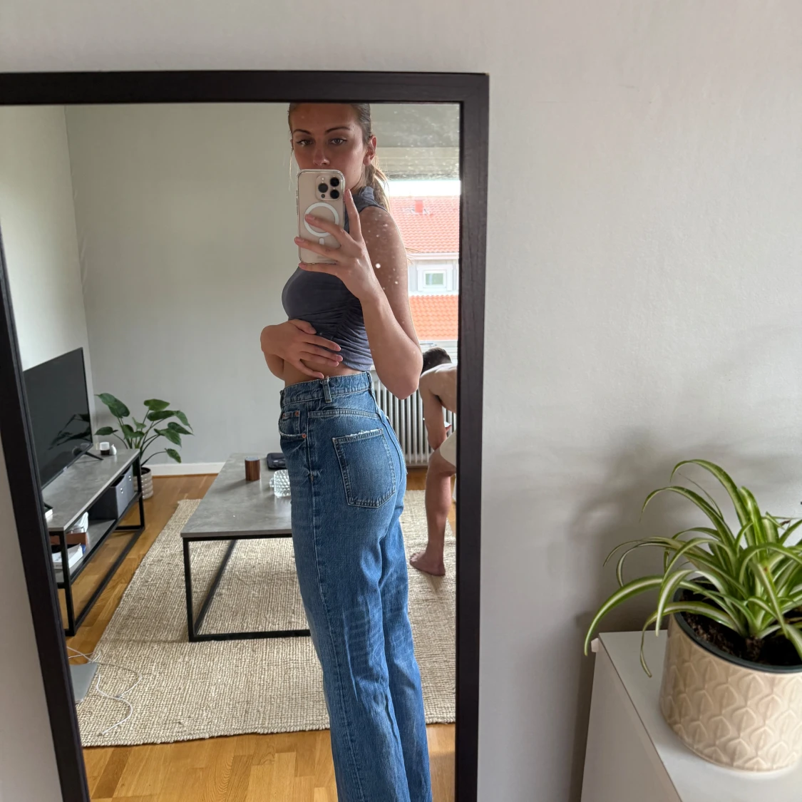 Säljer ett par klassiska blå jeans med hög midja och raka ben. Tyvärr för korta för mig som är 182 cm!!